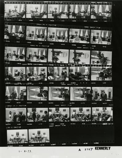 Keywords: Ford A2707 NLGRF photo contact sheet (1975-01-08)(Gerald Ford Library).jpg White House Photographic Office WHPO is housed at the Gerald R Ford Presidential Library a branch of the National Archives and Records Administration NARA <br/><br/> This file is a 200 dpi photo contact sheet having images from roll of film A2707 of the August 9 1974 - January 20 1977 Gerald R Ford White House Photographic Office Series A0001-A9999 and B0001-B2886 photographs <br/><br/> The date on the photo contact sheet is the date the roll of film was processed not necessarily the date the photographs were taken See table below for additional details 1975-01-08 Gerald R Ford Presidential Library Image http //www fordlibrarymuseum gov/library/whphotos/A2707_NLGRF jpg A2707_NLGRF jpg from http //www fordlibrarymuseum gov/library/whphotos/19750108whpo pdf White House Photographs January 8 1975 of the http //www fordlibrarymuseum gov/Library/whphotos/whpo asp White House Photographic Collection page White House Photographic Office WHPO <br/> Creator David Hume Kennerly PD-USGov Institution Institution Gerald R Ford Presidential Library Table wikitable sortable + Photo contact sheet A2707 U S President Ford Administration Gerald R Ford Library Frame s Tone Subject proper Subject generic Names Geographic Location Photographer Date - 3-14 BW Time Photographer seated around desk talking - various angles and distances; Eddy Adams taking photos in last six frames GRF Orben Oval Office Kennerly 1975-01-08 - 15-16 BW Video Tape Recorder Operator WHCA and Trainer of Liberty; Pet Golden Retriever Brockett standing near exterior door; GRF stooping petting dog GRF Bill Brockett Liberty Oval Office Kennerly 1975-01-08 - 17-20 BW Video Tape Recorder Operator WHCA and Trainer of Liberty; Time Photographer; Pet Golden Retriever GRF and Brockett seated around desk dog nearby; Adams taking photographs various angles and distances; Brockett and Adams not in all frames GRF Bill Brockett Eddy Adams Liberty Oval Office Kennerly 1975-01-08 - 21-22 BW Pet Golden Retriever GRF seated at desk petting dog smiling GRF Liberty Oval Office Kennerly 1975-01-08 - 23-26 BW Video Tape Recorder Operator WHCA and Trainer of Liberty; Pet Golden Retriever GRF seated at edge of desk talking; dog nearby; Brockett not in second frame GRF Bill Brockett Liberty Oval Office Kennerly 1975-01-08 - 27-29 BW Meeting to Discuss US-China Relations; US Senator from Montana MT greeting handshaking standing talking walking toward fireplace - all not in every frame GRF Kissinger Rockefeller Sen Mansfield Rumsfeld Marsh Oval Office Kennerly 1975-01-08 - 30-34 BW Meeting to Discuss US-China Relations; US Senator from Montana MT seated near fireplace talking - various angles GRF Kissinger Rockefeller Sen Mansfield Rumsfeld Marsh Oval Office Kennerly 1975-01-08 Gerald R Ford Presidential Library and Museum-cooperation PD-USGov Contact sheets by the Ford White House January 1975 Photographs by David Hume Kennerly from 1975 |