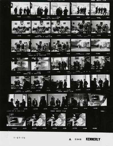 | Keywords: Ford A2948 NLGRF photo contact sheet (1975-01-27)(Gerald Ford Library).jpg White House Photographic Office WHPO is housed at the Gerald R Ford Presidential Library a branch of the National Archives and Records Administration NARA <br/><br/> This file is a 200 dpi photo contact sheet having images from roll of film A2948 of the August 9 1974 - January 20 1977 Gerald R Ford White House Photographic Office Series A0001-A9999 and B0001-B2886 photographs <br/><br/> The date on the photo contact sheet is the date the roll of film was processed not necessarily the date the photographs were taken See table below for additional details 1975-01-27 Gerald R Ford Presidential Library Image http //www fordlibrarymuseum gov/library/whphotos/A2948_NLGRF jpg A2948_NLGRF jpg from http //www fordlibrarymuseum gov/library/whphotos/19750127whpo pdf White House Photographs January 27 1975 of the http //www fordlibrarymuseum gov/Library/whphotos/whpo asp White House Photographic Collection page White House Photographic Office WHPO <br/> Creator David Hume Kennerly PD-USGov Institution Institution Gerald R Ford Presidential Library Table wikitable sortable + Photo contact sheet A2948 U S President Ford Administration Gerald R Ford Library Frame s Tone Subject proper Subject generic Names Geographic Location Photographer Date - 15A-19A BW Landscape Photographer standing talking walking GRF Betty Ford Ansel Adams Sidewalk Between Oval Office and South Driveway Kennerly 1975-01-27 - 20A-23A BW Landscape Photographer seated near fireplace GRF Ansel Adams Oval Office Kennerly 1975-01-27 - 24A-29A BW Landscape Photographer; Business Manager New York Times Photographer GRF Ansel Adams William Turnage Mike Lein Others President's Private Office Kennerly 1975-01-27 - 30A-35A BW White House Tour For Landscape Photographer standing talking Betty Ford Ansel Adams Second Floor -Treaty Room Kennerly 1975-01-27 - 2A-9A BW Former U S Ambassador to India standing talking; seated near fireplace -all not in every frame GRF Daniel Patrick Moynihan Rumsfeld Kissinger Oval Office Kennerly 1975-01-27 - 10A-14A BW Landscape Photographer; Business Manager standing near desk GRF Betty Ford Ansel Adams William Turnage Oval Office Kennerly 1975-01-27 Gerald R Ford Presidential Library and Museum-cooperation PD-USGov Contact sheets by the Ford White House January 1975 Photographs by David Hume Kennerly from 1975 |