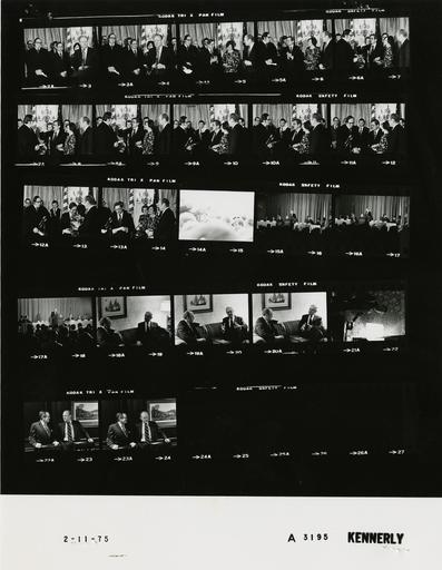 | Keywords: Ford A3195 NLGRF photo contact sheet (1975-02-10)(Gerald Ford Library).jpg White House Photographic Office WHPO is housed at the Gerald R Ford Presidential Library a branch of the National Archives and Records Administration NARA <br/><br/> This file is a 200 dpi photo contact sheet having images from roll of film A3195 of the August 9 1974 - January 20 1977 Gerald R Ford White House Photographic Office Series A0001-A9999 and B0001-B2886 photographs <br/><br/> The date on the photo contact sheet is the date the roll of film was processed not necessarily the date the photographs were taken See table below for additional details 1975-02-10 Gerald R Ford Presidential Library Image http //www fordlibrarymuseum gov/library/whphotos/A3195_NLGRF jpg A3195_NLGRF jpg from http //www fordlibrarymuseum gov/library/whphotos/19750210whpo pdf White House Photographs February 10 1975 of the http //www fordlibrarymuseum gov/Library/whphotos/whpo asp White House Photographic Collection page White House Photographic Office WHPO <br/> Creator David Hume Kennerly PD-USGov Institution Institution Gerald R Ford Presidential Library Table wikitable sortable + Photo contact sheet A3195 U S President Ford Administration Gerald R Ford Library Frame s Tone Subject proper Subject generic Names Geographic Location Photographer Date - 2A-13A BW Swearing in of Director of Office of Management and Budget OMB GRF at microphone in 2A3A; standing talking; Lynn at microphone in frames 11A-13A GRF Lynn Joan Lynn William Rehnquist; Others Cabinet Room Kennerly 1975-02-10 - 14A BW Kennerly 1975-02-10 - 15A-17A BW Trip to Houston Texas -Houston Chamber of Commerce Energy/Economic Conference - Houston Texas GRF speaking from lectern; various angles and distances; all not in every frame GRF Others Houston TX Shamrock Hilton Hotel - Emerald Room Kennerly 1975-02-10 - 18A-20A BW Trip to Houston Texas -Meeting with Former Governor of Texas and Attorney with Vinson Elkins Searls Connally and Smith seated talking; close ups GRF John Connolly Houston TX Shamrock Hilton Hotel - President's Suite Kennerly 1975-02-10 - 21A BW Trip to Houston Texas standing by telephone Military Aide Houston TX Shamrock Hilton Hotel - President's Suite Kennerly 1975-02-10 - 22A-23A BW Trip to Houston Texas standing talking GRF Unidentified Man Houston TX Shamrock Hilton Hotel Kennerly 1975-02-10 Gerald R Ford Presidential Library and Museum-cooperation PD-USGov Contact sheets by the Ford White House February 1975 Photographs by David Hume Kennerly from 1975 |