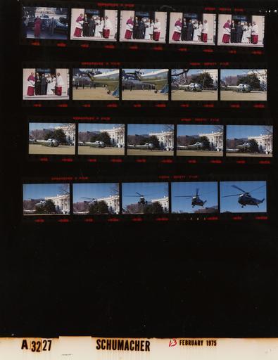 | Keywords: Ford A3227 NLGRF photo contact sheet (1975-02-13)(Gerald Ford Library).jpg White House Photographic Office WHPO is housed at the Gerald R Ford Presidential Library a branch of the National Archives and Records Administration NARA <br/><br/> This file is a 200 dpi photo contact sheet having images from roll of film A3227 of the August 9 1974 - January 20 1977 Gerald R Ford White House Photographic Office Series A0001-A9999 and B0001-B2886 photographs <br/><br/> The date on the photo contact sheet is the date the roll of film was processed not necessarily the date the photographs were taken See table below for additional details 1975-02-13 Gerald R Ford Presidential Library Image http //www fordlibrarymuseum gov/library/whphotos/A3227_NLGRF jpg A3227_NLGRF jpg from http //www fordlibrarymuseum gov/library/whphotos/19750213whpo pdf White House Photographs February 13 1975 of the http //www fordlibrarymuseum gov/Library/whphotos/whpo asp White House Photographic Collection page White House Photographic Office WHPO - Schumacher PD-USGov Institution Institution Gerald R Ford Presidential Library Table wikitable sortable + Photo contact sheet A3227 U S President Ford Administration Gerald R Ford Library Frame s Tone Subject proper Subject generic Names Geographic Location Photographer Date - 3 Color Arrival for Wedding of Nancy Lammerding and Nicholas Ruwe GRF and BF stepping from limousine GRF Betty Ford Rev Raymond Powers Keiser Washington DC Chapel of the Apostolic Delegate - Outside Schumacher 1975-02-13 - 4-8 Color Departure Following Wedding of Nancy Lammerding and Nicholas Ruwe standing talking at top of steps; all not in every frame GRF Betty Ford Nancy Lammerding Nicholas Ruwe Rev Raymond Powers Archbishop Jean Jadot Washington DC Chapel of the Apostolic Delegate - Outside Schumacher 1975-02-13 - 9-22 Color Departure for Andrews Air Force Base Marine One helicopter ascending; White House in background; GRF and others in frames 9-12 GRF Kennerly Others South Lawn Schumacher 1975-02-13 Gerald R Ford Presidential Library and Museum-cooperation PD-USGov Contact sheets by the Ford White House February 1975 |
