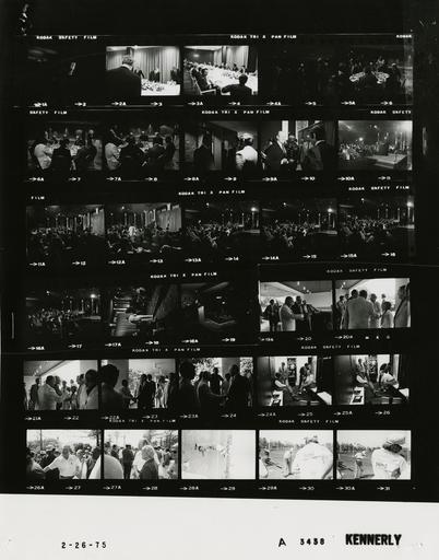 Keywords: Ford A3438 NLGRF photo contact sheet (1975-02-26)(Gerald Ford Library).jpg White House Photographic Office WHPO is housed at the Gerald R Ford Presidential Library a branch of the National Archives and Records Administration NARA <br/><br/> This file is a 200 dpi photo contact sheet having images from roll of film A3438 of the August 9 1974 - January 20 1977 Gerald R Ford White House Photographic Office Series A0001-A9999 and B0001-B2886 photographs <br/><br/> The date on the photo contact sheet is the date the roll of film was processed not necessarily the date the photographs were taken See table below for additional details 1975-02-26 Gerald R Ford Presidential Library Image http //www fordlibrarymuseum gov/library/whphotos/A3438_NLGRF jpg A3438_NLGRF jpg from http //www fordlibrarymuseum gov/library/whphotos/19750226whpo pdf White House Photographs February 26 1975 of the http //www fordlibrarymuseum gov/Library/whphotos/whpo asp White House Photographic Collection page White House Photographic Office WHPO <br/> Creator David Hume Kennerly PD-USGov Institution Institution Gerald R Ford Presidential Library Table wikitable sortable + Photo contact sheet A3438 U S President Ford Administration Gerald R Ford Library Frame s Tone Subject proper Subject generic Names Geographic Location Photographer Date - 2-10 BW Trip to Florida - Working Breakfast - Fort Lauderdale Florida seated around tables eating talking; standing talking in frames 8A 9A; various angles and distances; all not in every frame GRF Barrett Media Executives Fort Lauderdale FL Diplomat Hotel - Capitol Room Kennerly 1975-02-26 - 11-19 BW Trip to Florida - Press Conference - Fort Lauderdale Florida GRF at podium; various angles and distances; all not in every frame GRF Media Fort Lauderdale FL Convention Hall - Diplomat Hotel Kennerly 1975-02-26 - 20-24 BW Trip to Florida - Arrival for Jackie Gleason Inverrary Classic Celebrities Golf Tournament - Hollywood Florida GRF arriviing at club; greeting handshaking standing talking; all not in every frame GRF Others Hollywood FL Inverrary Country Club Kennerly 1975-02-26 - 25-26 BW Trip to Florida - Jackie Gleason Inverrary Classic Celebrities Golf Tournament - Hollywood Florida - American Comedian and Actor seated talking; GRF putting on golf shoes GRF Jackie Gleason Hollywood FL Inverrary Country Club - Locker Room Kennerly 1975-02-26 - 27-28 BW Trip to Florida - Jackie Gleason Inverrary Classic Celebrities Golf Tournament - Hollywood Florida greeting handshaking posing; all not in both frames GRF Others Hollywood FL Inverrary Country Club Kennerly 1975-02-26 - 29-31 BW Trip to Florida - Jackie Gleason Inverrary Classic Celebrities Golf Tournament - Hollywood Florida on golf course; GRF teeing off in frames 30 31 GRF Others Hollywood FL Inverrary Country Club Kennerly 1975-02-26 Gerald R Ford Presidential Library and Museum-cooperation PD-USGov Contact sheets by the Ford White House February 1975 Photographs by David Hume Kennerly from 1975 |