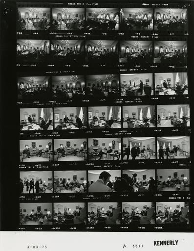 Keywords: Ford A3511 NLGRF photo contact sheet (1975-03-03)(Gerald Ford Library).jpg White House Photographic Office WHPO is housed at the Gerald R Ford Presidential Library a branch of the National Archives and Records Administration NARA <br/><br/> This file is a 200 dpi photo contact sheet having images from roll of film A3511 of the August 9 1974 - January 20 1977 Gerald R Ford White House Photographic Office Series A0001-A9999 and B0001-B2886 photographs <br/><br/> The date on the photo contact sheet is the date the roll of film was processed not necessarily the date the photographs were taken See table below for additional details 1975-03-03 Gerald R Ford Presidential Library Image http //www fordlibrarymuseum gov/library/whphotos/A3511_NLGRF jpg A3511_NLGRF jpg from http //www fordlibrarymuseum gov/library/whphotos/19750303whpo pdf White House Photographs March 3 1975 of the http //www fordlibrarymuseum gov/Library/whphotos/whpo asp White House Photographic Collection page White House Photographic Office WHPO <br/> Creator David Hume Kennerly PD-USGov Institution Institution Gerald R Ford Presidential Library Table wikitable sortable + Photo contact sheet A3511 U S President Ford Administration Gerald R Ford Library Frame s Tone Subject proper Subject generic Names Geographic Location Photographer Date - 3-15 BW Meeting With House and Senate Republican Leaders seated around table; long shots at different angles; all may not be in frames GRF Cabinet Members Republican Leadership Cabinet Room Kennerly 1975-03-03 - 16 BW standing behind desk GRF Oval Office Kennerly 1975-03-03 - 17-22 BW Kissinger standing in frame 17; seated around desk in others; GRF wearing cowboy hat in frames 17-18 GRF Kissinger Oval Office Kennerly 1975-03-03 - 23-25 BW Meeting With Attorney General near fireplace; Buchen and Connor not in frame 25 GRF Levi Buchen Connor Oval Office Kennerly 1975-03-03 - 26-37 BW Meeting With President of Israel -Ambassador from Israel to the US; Director of the Office of the Presidency of Israel near fireplace; various angles; all not in every frame; media in some frames GRF Ephraim Katzir Amb Dinitz Gideon Shamron Scowcroft Oval Office Kennerly 1975-03-03 Gerald R Ford Presidential Library and Museum-cooperation PD-USGov Contact sheets by the Ford White House March 1975 Photographs by David Hume Kennerly from 1975 |
