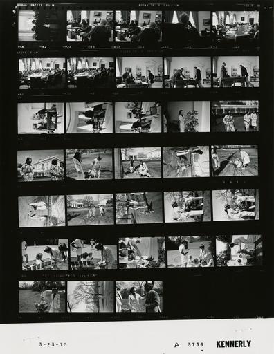 | Keywords: Ford A3756 NLGRF photo contact sheet (1975-03-23)(Gerald Ford Library).jpg White House Photographic Office WHPO is housed at the Gerald R Ford Presidential Library a branch of the National Archives and Records Administration NARA <br/><br/> This file is a 200 dpi photo contact sheet having images from roll of film A3756 of the August 9 1974 - January 20 1977 Gerald R Ford White House Photographic Office Series A0001-A9999 and B0001-B2886 photographs <br/><br/> The date on the photo contact sheet is the date the roll of film was processed not necessarily the date the photographs were taken See table below for additional details 1975-03-23 Gerald R Ford Presidential Library Image http //www fordlibrarymuseum gov/library/whphotos/A3756_NLGRF jpg A3756_NLGRF jpg from http //www fordlibrarymuseum gov/library/whphotos/19750323whpo pdf White House Photographs March 23 1975 of the http //www fordlibrarymuseum gov/Library/whphotos/whpo asp White House Photographic Collection page White House Photographic Office WHPO <br/> Creator David Hume Kennerly PD-USGov Institution Institution Gerald R Ford Presidential Library Table wikitable sortable + Photo contact sheet A3756 U S President Ford Administration Gerald R Ford Library Frame s Tone Subject proper Subject generic Names Geographic Location Photographer Date - 2 BW Date may not be correct standing talking GRF Others Center Hall Kennerly 1975-03-23 - 3-5 BW around desk; various angles GRF Morton Oval Office Kennerly 1975-03-23 - 6-8 BW Meeting to Discuss Tax Legislation around table; all not in every frame; various angles and distances GRF Weinberger Simon Burns Frederic Hickman Rumsfeld Seidman Greenspan Lynn Marsh Friedersdorf Cheney O'Neill Gerald Warren Cabinet Room Kennerly 1975-03-23 - 9-14 BW standing around desk talking; various angles and distances GRF Rumsfeld Oval Office Kennerly 1975-03-23 - 15-34 BW Pet Golden Retriever BF touring grounds with Fukuda;and Liberty stop by tennis courts; O'Donnell family Betty Ford Marika Fukuda; Terry O'Donnell Mrs Terry O'Donnell O'Donnell children Liberty Others South Grounds/Tennis Courts Kennerly 1975-03-23 Gerald R Ford Presidential Library and Museum-cooperation PD-USGov Contact sheets by the Ford White House March 1975 Photographs by David Hume Kennerly from 1975 |