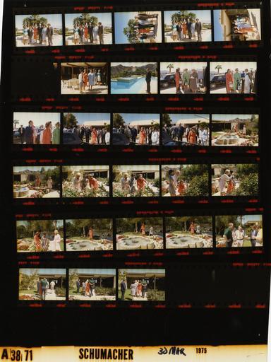 Keywords: Ford A3871 NLGRF photo contact sheet (1975-03-30)(Gerald Ford Library).jpg White House Photographic Office WHPO is housed at the Gerald R Ford Presidential Library a branch of the National Archives and Records Administration NARA <br/><br/> This file is a 200 dpi photo contact sheet having images from roll of film A3871 of the August 9 1974 - January 20 1977 Gerald R Ford White House Photographic Office Series A0001-A9999 and B0001-B2886 photographs <br/><br/> The date on the photo contact sheet is the date the roll of film was processed not necessarily the date the photographs were taken See table below for additional details 1975-03-30 Gerald R Ford Presidential Library Image http //www fordlibrarymuseum gov/library/whphotos/A3871_NLGRF jpg A3871_NLGRF jpg from http //www fordlibrarymuseum gov/library/whphotos/19750330whpo pdf White House Photographs March 30 1975 of the http //www fordlibrarymuseum gov/Library/whphotos/whpo asp White House Photographic Collection page White House Photographic Office WHPO - Schumacher PD-USGov Institution Institution Gerald R Ford Presidential Library Table wikitable sortable + Photo contact sheet A3871 U S President Ford Administration Gerald R Ford Library Frame s Tone Subject proper Subject generic Names Geographic Location Photographer Date - 5A-8A Color Vacation Trip to California -Palm Springs California standing posing GRF Betty Ford Mr Mrs Leon Parma Others Palm Springs CA Presidential Vacation Residence - Outside Schumacher 1975-03-30 - 9A-11A Color Vacation Trip to California -Palm Springs California standing talking - second frame very dark Betty Ford Barbara Parma Others Palm Springs CA Presidential Vacation Residence - Outside Schumacher 1975-03-30 - 12A Color Vacation Trip to California -Palm Springs California standing near swimming pool GRF Palm Springs CA Presidential Vacation Residence - Outside Schumacher 1975-03-30 - 13A-15A Color Vacation Trip to California -Arrival for Easter Sunday Worship Service -Palm Springs California - Bishop of the Episcopal Diocese of San Diego California; Rector of St Margaret's Episcopal Church greeting near limousine; all not in every frame GRF Betty Ford Bishop Robert Wolferstorff Rev John Harrison Spouses Others Palm Springs CA St Margaret's Episcopal Church - Outside Schumacher 1975-03-30 - 16A-18A Color Vacation Trip to California -Following Easter Sunday Worship Service -Palm Springs California waving walking toward limousine; all not in every frame GRF Betty Ford Others Palm Springs CA St Margaret's Episcopal Church - Outside Schumacher 1975-03-30 - 19A-30A Color Vacation Trip to California -Palm Springs California walking around grounds; all not in every frame; GRF and Hartmann 29A GRF Betty Ford Weidenfeld Hartmann Others Palm Springs CA Presidential Vacation Residence - Outside Schumacher 1975-03-30 - 31A-32A Color Vacation Trip to California -Palm Springs California walking toward house; GRF and BF arm-in-arm; backs to camera GRF Betty Ford Others Palm Springs CA Presidential Vacation Residence - Outside Schumacher 1975-03-30 Gerald R Ford Presidential Library and Museum-cooperation PD-USGov Contact sheets by the Ford White House March 1975 |