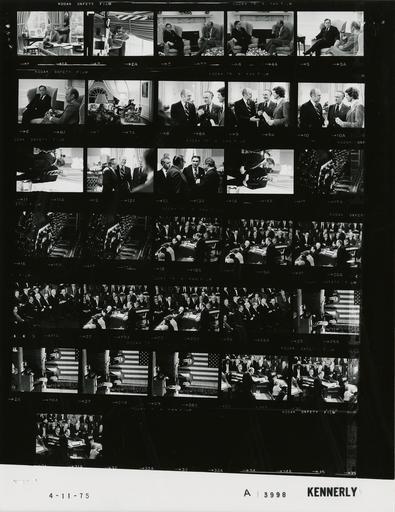 | Keywords: Ford A3998 NLGRF photo contact sheet (1975-04-10)(Gerald Ford Library).jpg White House Photographic Office WHPO is housed at the Gerald R Ford Presidential Library a branch of the National Archives and Records Administration NARA <br/><br/> This file is a 200 dpi photo contact sheet having images from roll of film A3998 of the August 9 1974 - January 20 1977 Gerald R Ford White House Photographic Office Series A0001-A9999 and B0001-B2886 photographs <br/><br/> The date on the photo contact sheet is the date the roll of film was processed not necessarily the date the photographs were taken See table below for additional details 1975-04-10 Gerald R Ford Presidential Library Image http //www fordlibrarymuseum gov/library/whphotos/A3998_NLGRF jpg A3998_NLGRF jpg from http //www fordlibrarymuseum gov/library/whphotos/19750410whpo pdf White House Photographs April 10 1975 of the http //www fordlibrarymuseum gov/Library/whphotos/whpo asp White House Photographic Collection page White House Photographic Office WHPO <br/> Creator David Hume Kennerly PD-USGov Institution Institution Gerald R Ford Presidential Library Table wikitable sortable + Photo contact sheet A3998 U S President Ford Administration Gerald R Ford Library Frame s Tone Subject proper Subject generic Names Geographic Location Photographer Date - 1A-2A BW at desk; writing smoking pipe in second frame GRF Oval Office Kennerly 1975-04-10 - 3A-6A BW near fireplace GRF Rep Albert Oval Office Kennerly 1975-04-10 - 7A BW Prior to State of the World Address seated reading speech smoking pipe GRF Second Floor - West Sitting Hall Kennerly 1975-04-10 - 8A-14A BW Prior to State of the World Address standing talking walking; all not in every frame GRF Sens Mansfield Scott; Reps Rhodes McFall; Others Washington DC United States Capitol -Room H210 Kennerly 1975-04-10 - 15A-23A BW State of the World Address GRF at podium; various distances; all not in every frame GRF Floor Guests Washington DC United States Capitol -House Floor Kennerly 1975-04-10 - 24A BW State of the World Address seated listening Cabinet Washington DC United States Capitol -House Floor Kennerly 1975-04-10 - 25A-28A BW State of the World Address GRF at podium; others seated; close ups taken from Gallery GRF Rockefeller Rep Albert Washington DC United States Capitol -House Floor Kennerly 1975-04-10 - 29A-31A BW Following State of the World Address GRF walking from podium GRF Floor Guests Washington DC United States Capitol -House Floor Kennerly 1975-04-10 Gerald R Ford Presidential Library and Museum-cooperation PD-USGov Contact sheets by the Ford White House April 1975 Photographs by David Hume Kennerly from 1975 |