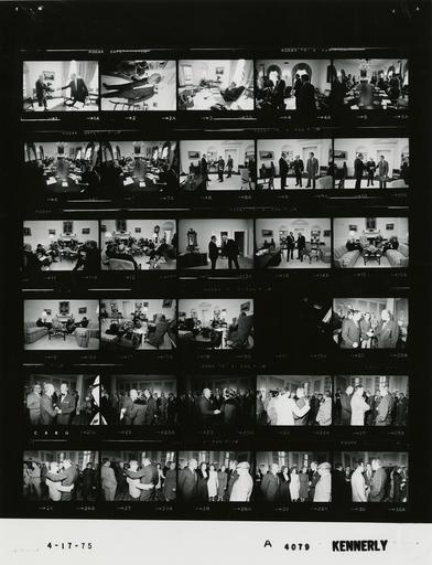 Keywords: Ford A4079 NLGRF photo contact sheet (1975-04-17)(Gerald Ford Library).jpg White House Photographic Office WHPO is housed at the Gerald R Ford Presidential Library a branch of the National Archives and Records Administration NARA <br/><br/> This file is a 200 dpi photo contact sheet having images from roll of film A4079 of the August 9 1974 - January 20 1977 Gerald R Ford White House Photographic Office Series A0001-A9999 and B0001-B2886 photographs <br/><br/> The date on the photo contact sheet is the date the roll of film was processed not necessarily the date the photographs were taken See table below for additional details 1975-04-17 Gerald R Ford Presidential Library Image http //www fordlibrarymuseum gov/library/whphotos/A4079_NLGRF jpg A4079_NLGRF jpg from http //www fordlibrarymuseum gov/library/whphotos/19750417whpo pdf White House Photographs April 17 1975 of the http //www fordlibrarymuseum gov/Library/whphotos/whpo asp White House Photographic Collection page White House Photographic Office WHPO <br/> Creator David Hume Kennerly PD-USGov Institution Institution Gerald R Ford Presidential Library Table wikitable sortable + Photo contact sheet A4079 U S President Ford Administration Gerald R Ford Library Frame s Tone Subject proper Subject generic Names Geographic Location Photographer Date - 1 BW greeting handshaking GRF Burns Oval Office Kennerly 1975-04-17 - 2 BW closing drawer on side table; smoking pipe GRF Oval Office Kennerly 1975-04-17 - 3 BW seated around desk; Burns speaking gesturing GRF Burns Oval Office Kennerly 1975-04-17 - 4-7 BW Economy and Energy Meeting GRF entering room smoking pipe in first frame; around table in others GRF Seidman Greenspan Morton Dunlop Burns Zarb Lynn Scowcroft Gardner Marsh Dunham Rumsfeld Nessen Raoul-Duval Zausner Cheney Carlson Porter Cabinet Room Kennerly 1975-04-17 - 8-10 BW US Senators from Arkansas AR and Oklahoma OK greeting handshaking GRF Sens McClellan Bartlett Oval Office Kennerly 1975-04-17 - 11-12 BW Meeting to Discuss S1306 Authorizing a Loan to the Chicago Rock Island and Pacific Railroad near fireplace; Coleman not seen in first frame GRF Sens McClellan Bartlett Sec Coleman Cannon Patrick O'Donnell Oval Office Kennerly 1975-04-17 - 13 BW Professor of Law Yale University standing talking Kissinger Eugene Rostow Scheduling and Advance Office Kennerly 1975-04-17 - 14 BW Professor of Law Yale University greeting handshaking GRF Eugene Rostow Oval Office Kennerly 1975-04-17 - 15-18 BW Professor of Law Yale University near fireplace; various angles and distances GRF Eugene Rostow; Kissinger Oval Office Kennerly 1975-04-17 - 19 BW Kennerly 1975-04-17 - 20-30 BW Drop-by at Party in Honor of Sen Clifford Hansen of Wyoming WY greeting handshaking standing talking; all not in every frame; GRF in formal wear GRF Betty Ford Others Washington DC University Club Kennerly 1975-04-17 Gerald R Ford Presidential Library and Museum-cooperation PD-USGov Contact sheets by the Ford White House April 1975 Photographs by David Hume Kennerly from 1975 |