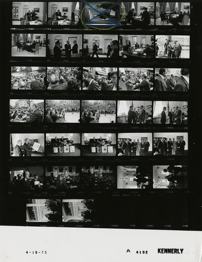| Keywords: Ford A4102 NLGRF photo contact sheet (1975-04-18)(Gerald Ford Library).jpg White House Photographic Office WHPO is housed at the Gerald R Ford Presidential Library a branch of the National Archives and Records Administration NARA <br/><br/> This file is a 200 dpi photo contact sheet having images from roll of film A4102 of the August 9 1974 - January 20 1977 Gerald R Ford White House Photographic Office Series A0001-A9999 and B0001-B2886 photographs <br/><br/> The date on the photo contact sheet is the date the roll of film was processed not necessarily the date the photographs were taken See table below for additional details 1975-04-18 Gerald R Ford Presidential Library Image http //www fordlibrarymuseum gov/library/whphotos/A4102_NLGRF jpg A4102_NLGRF jpg from http //www fordlibrarymuseum gov/library/whphotos/19750418whpo pdf White House Photographs April 18 1975 of the http //www fordlibrarymuseum gov/Library/whphotos/whpo asp White House Photographic Collection page White House Photographic Office WHPO <br/> Creator David Hume Kennerly PD-USGov Institution Institution Gerald R Ford Presidential Library Table wikitable sortable + Photo contact sheet A4102 U S President Ford Administration Gerald R Ford Library Frame s Tone Subject proper Subject generic Names Geographic Location Photographer Date - 12A-17A BW Trip to New Hampshire -Arrival at the State House - Manchester New Hampshire greeting handshaking GRF Crowd Manchester NH New Hampshire State House - Outside Kennerly 1975-04-18 - 18A-19A BW Trip to New Hampshire -Arrival at the State House - Manchester New Hampshire GRF speaking at microphone; crowd in background GRF Crowd Manchester NH New Hampshire State House - Outside Kennerly 1975-04-18 - 20A-21A BW Trip to New Hampshire -Arrival at the State House - Speaker of House; President of Senate - Manchester New Hampshire greeting handshaking GRF Rep George Roberts Sen Alf Jacobson Manchester NH New Hampshire State House - Council Room Kennerly 1975-04-18 - 22A-24A BW Trip to New Hampshire -Presentation of Gifts - Manchester New Hampshire seated behind framed artwork; included portrait s of Franklin Pierce GRF Unidentified Man Manchester NH New Hampshire State House - Council Room Kennerly 1975-04-18 - 25A-26A BW Trip to New Hampshire -Meeting With Escort Committee - Manchester New Hampshire standing posing GRF Richard Fernandino Marshall French Chris Spirou Ward Brown Delbert Downing Others Manchester NH New Hampshire State House - Council Room Kennerly 1975-04-18 - 27A BW Trip to New Hampshire -Prior to Speech Before a Joint Session of the New Hampshire State Legislature -Manchester New Hampshire entering room GRF O'Donnell Manchester NH New Hampshire State House - House Chamber Kennerly 1975-04-18 - 28A-29A BW Trip to New Hampshire -Speech Before a Joint Session of the New Hampshire State Legislature - Manchester New Hampshire GRF at podium; long shots from balcony GRF Legislators Manchester NH New Hampshire State House - House Chamber Kennerly 1975-04-18 - 30A-33A BW Trip to New Hampshire -Photo Opportunity with New Hampshire State Senators - Manchester New Hampshire greeting handshaking; all not in every frame GRF Senators Manchester NH Senate Chamber - New Hampshire State House Kennerly 1975-04-18 - 2A-3A BW greeting handshaking walking toward desk GRF Rockefeller Oval Office Kennerly 1975-04-18 - 4A BW entering Oval Office; BS turning back to camera Kissinger Scowcroft Scheduling and Advance Office Kennerly 1975-04-18 - 5A-7A BW seated around desk; all not in every frame GRF Rockefeller Kissinger Scowcroft Oval Office Kennerly 1975-04-18 - 8A-9A BW US Ambassador to the German Democratic Republic West Germany greeting handshaking walking toward desk GRF Kissinger Amb John Sherman Cooper Oval Office Kennerly 1975-04-18 - 10A BW US Ambassador to the German Democratic Republic West Germany seated around desk GRF Kissinger Amb John Sherman Cooper Oval Office Kennerly 1975-04-18 - 11A BW Trip to New Hampshire -Manchester New Hampshire greeting handshaking GRF Gov Thompson Norris Cotton Manchester NH Grenier Field Kennerly 1975-04-18 Gerald R Ford Presidential Library and Museum-cooperation PD-USGov Contact sheets by the Ford White House April 1975 Photographs by David Hume Kennerly from 1975 |