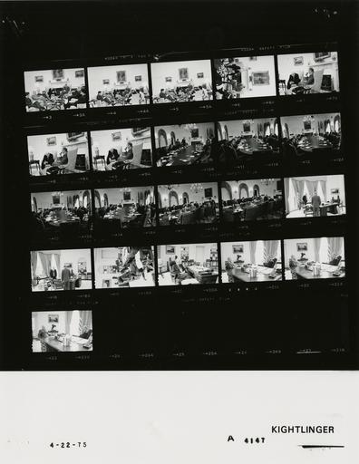 | Keywords: Ford A4147 NLGRF photo contact sheet (1975-04-21)(Gerald Ford Library).jpg White House Photographic Office WHPO is housed at the Gerald R Ford Presidential Library a branch of the National Archives and Records Administration NARA <br/><br/> This file is a 200 dpi photo contact sheet having images from roll of film A4147 of the August 9 1974 - January 20 1977 Gerald R Ford White House Photographic Office Series A0001-A9999 and B0001-B2886 photographs <br/><br/> The date on the photo contact sheet is the date the roll of film was processed not necessarily the date the photographs were taken See table below for additional details 1975-04-21 Gerald R Ford Presidential Library Image http //www fordlibrarymuseum gov/library/whphotos/A4147_NLGRF jpg A4147_NLGRF jpg from http //www fordlibrarymuseum gov/library/whphotos/19750421whpo pdf White House Photographs April 21 1975 of the http //www fordlibrarymuseum gov/Library/whphotos/whpo asp White House Photographic Collection page White House Photographic Office WHPO - Kightlinger PD-USGov Institution Institution Gerald R Ford Presidential Library Table wikitable sortable + Photo contact sheet A4147 U S President Ford Administration Gerald R Ford Library Frame s Tone Subject proper Subject generic Names Geographic Location Photographer Date - 3-5 BW Meeting With Director-General World Food Council to Discuss The World Food Conference near fireplace GRF Butz John Hannah Seidman Robert Hormats Cannon Oval Office Kightlinger 1975-04-21 - 6-9 BW Meeting With Director-General World Food Council to Discuss The World Food Conference near fireplace GRF John Hannah Oval Office Kightlinger 1975-04-21 - 10-16 BW Economic/Energy Meeting around table; all not in every frame; various angles GRF Rockefeller Seidman Greenspan Dunlop Lynn Morton Burns Zarb Marsh Stephen Gardner Dunham Cheney Rumsfeld Hartmann Carlson Porter Robert Hormats Cabinet Room Kightlinger 1975-04-22 - 17-18 BW Meeting with Federal Reserve Chairman standing around desk; Burns' back to camera GRF Arthur Burns Oval Office Kightlinger 1975-04-22 - 19 BW Meeting with Federal Reserve Chairman seated at desk; listening hands folded in lap GRF Oval Office Kightlinger 1975-04-22 - 20-22 BW Meeting with Federal Reserve Chairman around desk GRF Arthur Burns Oval Office Kightlinger 1975-04-22 Gerald R Ford Presidential Library and Museum-cooperation PD-USGov Contact sheets by the Ford White House April 1975 |
