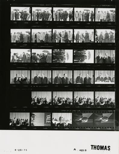 Keywords: Ford A4213 NLGRF photo contact sheet (1975-04-25)(Gerald Ford Library).jpg White House Photographic Office WHPO is housed at the Gerald R Ford Presidential Library a branch of the National Archives and Records Administration NARA <br/><br/> This file is a 200 dpi photo contact sheet having images from roll of film A4213 of the August 9 1974 - January 20 1977 Gerald R Ford White House Photographic Office Series A0001-A9999 and B0001-B2886 photographs <br/><br/> The date on the photo contact sheet is the date the roll of film was processed not necessarily the date the photographs were taken See table below for additional details 1975-04-25 Gerald R Ford Presidential Library Image http //www fordlibrarymuseum gov/library/whphotos/A4213_NLGRF jpg A4213_NLGRF jpg from http //www fordlibrarymuseum gov/library/whphotos/19750425whpo pdf White House Photographs April 25 1975 of the http //www fordlibrarymuseum gov/Library/whphotos/whpo asp White House Photographic Collection page White House Photographic Office WHPO - Thomas PD-USGov Institution Institution Gerald R Ford Presidential Library Table wikitable sortable + Photo contact sheet A4213 U S President Ford Administration Gerald R Ford Library Frame s Tone Subject proper Subject generic Names Geographic Location Photographer Date - 518 BW Trip to Connecticut - Arrival -New Haven Connecticut greeting handshaking; rain GRF under umbrella; Jet Star Aircraft in background; all not in every frame GRF Gov Mr Grasso Mayors Guida Messina; Irvin Grandville Mr Mrs David Gregory; Others New Haven CT Tweed New Haven Airport Thomas 1975-04-25 - 19-24 BW Trip to Connecticut - Yale Law School Sesquicentennial Convocation - New Haven Connecticut - Arrival standing talking waving; seated in last frame GRF Kingman Brewster New Haven CT Yale University - University Dining Hall Thomas 1975-04-25 - 25 BW Thomas 1975-04-25 - 26-31 BW Trip to Connecticut - Yale Law School Sesquicentennial Convocation - New Haven Connecticut-GRF Remarks GRF at podium; others standing applauding GRF Kingman Brewster Abraham Goldstein Others New Haven CT Yale University - University Dining Hall Thomas 1975-04-25 - 32-34 BW Trip to Connecticut - Yale Law School Sesquicentennial Convocation - New Haven Connecticut - GRF Remarks at podium; close up in last two frames GRF New Haven CT Yale University - University Dining Hall Thomas 1975-04-25 Gerald R Ford Presidential Library and Museum-cooperation PD-USGov Contact sheets by the Ford White House April 1975 |