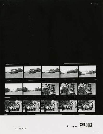 | Keywords: Ford A4656 NLGRF photo contact sheet (1975-05-20)(Gerald Ford Library).jpg White House Photographic Office WHPO is housed at the Gerald R Ford Presidential Library a branch of the National Archives and Records Administration NARA <br/><br/> This file is a 200 dpi photo contact sheet having images from roll of film A4656 of the August 9 1974 - January 20 1977 Gerald R Ford White House Photographic Office Series A0001-A9999 and B0001-B2886 photographs <br/><br/> The date on the photo contact sheet is the date the roll of film was processed not necessarily the date the photographs were taken See table below for additional details 1975-05-20 Gerald R Ford Presidential Library Image http //www fordlibrarymuseum gov/library/whphotos/A4656_NLGRF jpg A4656_NLGRF jpg from http //www fordlibrarymuseum gov/library/whphotos/19750520whpo pdf White House Photographs May 20 1975 of the http //www fordlibrarymuseum gov/Library/whphotos/whpo asp White House Photographic Collection page White House Photographic Office WHPO - Shaddix PD-USGov Institution Institution Gerald R Ford Presidential Library Table wikitable sortable + Photo contact sheet A4656 U S President Ford Administration Gerald R Ford Library Frame s Tone Subject proper Subject generic Names Geographic Location Photographer Date - 2A-3A BW Prior to Departure for Andrews Air Force Base standing near Marine One taking photographs Kennerly Susan Ford South Lawn Shaddix 1975-05-20 - 4A-8A BW Departure for Andrews Air Force Base Marine One ascending flying; moving away from camera; Washington Monument in background South Lawn Shaddix 1975-05-20 - 9A-16A BW Choir Group From Jacksonville Florida standing posing on steps Calhoun Choir Group South Portico Shaddix 1975-05-20 Gerald R Ford Presidential Library and Museum-cooperation PD-USGov Contact sheets by the Ford White House May 1975 |