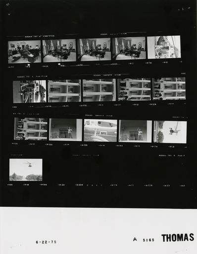 Keywords: Ford A5165 NLGRF photo contact sheet (1975-06-21)(Gerald Ford Library).jpg White House Photographic Office WHPO is housed at the Gerald R Ford Presidential Library a branch of the National Archives and Records Administration NARA <br/><br/> This file is a 200 dpi photo contact sheet having images from roll of film A5165 of the August 9 1974 - January 20 1977 Gerald R Ford White House Photographic Office Series A0001-A9999 and B0001-B2886 photographs <br/><br/> The date on the photo contact sheet is the date the roll of film was processed not necessarily the date the photographs were taken See table below for additional details 1975-06-21 Gerald R Ford Presidential Library Image http //www fordlibrarymuseum gov/library/whphotos/A5165_NLGRF jpg A5165_NLGRF jpg from http //www fordlibrarymuseum gov/library/whphotos/19750621whpo pdf White House Photographs June 21 1975 of the http //www fordlibrarymuseum gov/Library/whphotos/whpo asp White House Photographic Collection page White House Photographic Office WHPO - Thomas PD-USGov Institution Institution Gerald R Ford Presidential Library Table wikitable sortable + Photo contact sheet A5165 U S President Ford Administration Gerald R Ford Library Frame s Tone Subject proper Subject generic Names Geographic Location Photographer Date - 10-14 BW Departure for Camp David ; Sister-in-law; Pet Golden Retriever Janet on Truman Balcony waving; taken from South Driveway; GRF BF dog walking out of South Portico door in some frames; various distances Janet Ford; GRF Betty Ford Liberty South Lawn/Truman Balcony Thomas 1975-06-21 - 4-7 BW Pet Golden Retriever GRF moving around room; dog lying behind desk in 1st frame standing in remainder GRF Liberty Oval Office Thomas 1975-06-21 - 8-9 BW standing in doorway of Marine One taking photos; walking from helicopter Unidentified Photographer South Lawn Thomas 1975-06-21 - 15 BW Departure for Camp David waving from Marine One; barely visible through glare Betty Ford South Lawn Thomas 1975-06-21 - 16 BW Departure for Camp David - Sister in Law waving Janet Ford Truman Balcony Thomas 1975-06-21 - 17-18 BW Departure for Camp David Marine One ascending; Jefferson Memorial in background Marine One South Lawn Thomas 1975-06-21 Gerald R Ford Presidential Library and Museum-cooperation PD-USGov Contact sheets by the Ford White House June 1975 |