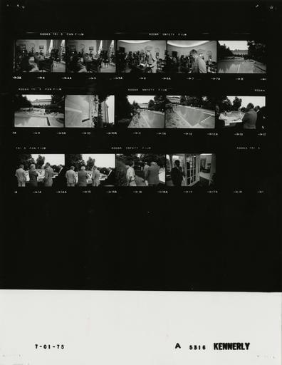 Keywords: Ford A5316 NLGRF photo contact sheet (1975-06-30)(Gerald Ford Library).jpg White House Photographic Office WHPO is housed at the Gerald R Ford Presidential Library a branch of the National Archives and Records Administration NARA <br/><br/> This file is a 200 dpi photo contact sheet having images from roll of film A5316 of the August 9 1974 - January 20 1977 Gerald R Ford White House Photographic Office Series A0001-A9999 and B0001-B2886 photographs <br/><br/> The date on the photo contact sheet is the date the roll of film was processed not necessarily the date the photographs were taken See table below for additional details 1975-06-30 Gerald R Ford Presidential Library Image http //www fordlibrarymuseum gov/library/whphotos/A5316_NLGRF jpg A5316_NLGRF jpg from http //www fordlibrarymuseum gov/library/whphotos/19750630whpo pdf White House Photographs June 30 1975 of the http //www fordlibrarymuseum gov/Library/whphotos/whpo asp White House Photographic Collection page White House Photographic Office WHPO <br/> Creator David Hume Kennerly PD-USGov Institution Institution Gerald R Ford Presidential Library Table wikitable sortable + Photo contact sheet A5316 U S President Ford Administration Gerald R Ford Library Frame s Tone Subject proper Subject generic Names Geographic Location Photographer Date - 4-5 BW Signing Ceremony for H R 6900 Emergency Unemployment Assistance Program GRF seated at desk signing Bill; others standing behind; media on left of frame GRF Dunlop Sen Nelson William Kolberg; Media Oval Office Kennerly 1975-06-30 - 6-7 BW Following Signing Ceremony for H R 6900 Emergency Unemployment Assistance Program GRF in foreground walking from desk; media in background GRF Media Oval Office Kennerly 1975-06-30 - 8-16 BW Swimming Pool Construction GRF and Hartmann behind barrier; workers near pool; water in pool; various angles and distances GRF Hartmann; Construction Workers Swimming Pool Site - White House Grounds Kennerly 1975-06-30 - 17 BW Working in Oval Office holding open door to Oval Office; GRF at desk inside Secret Service Agent; GRF Colonnade Kennerly 1975-06-30 Gerald R Ford Presidential Library and Museum-cooperation PD-USGov Contact sheets by the Ford White House June 1975 Photographs by David Hume Kennerly from 1975 |