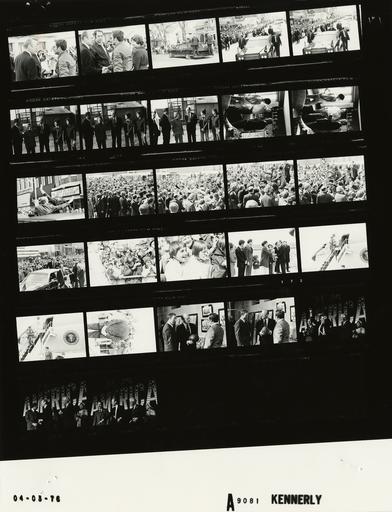 | Keywords: Ford A9081 NLGRF photo contact sheet (1976-04-02)(Gerald Ford Library).jpg White House Photographic Office WHPO is housed at the Gerald R Ford Presidential Library a branch of the National Archives and Records Administration NARA <br/><br/> This file is a 200 dpi photo contact sheet having images from roll of film A9081 of the August 9 1974 - January 20 1977 Gerald R Ford White House Photographic Office Series A0001-A9999 and B0001-B2886 photographs <br/><br/> The date on the photo contact sheet is the date the roll of film was processed not necessarily the date the photographs were taken See table below for additional details 1976-04-02 Gerald R Ford Presidential Library Image http //www fordlibrarymuseum gov/library/whphotos/A9081_NLGRF jpg A9081_NLGRF jpg from http //www fordlibrarymuseum gov/library/whphotos/19760402whpo pdf White House Photographs April 2 1976 of the http //www fordlibrarymuseum gov/Library/whphotos/whpo asp White House Photographic Collection page White House Photographic Office WHPO <br/> Creator David Hume Kennerly PD-USGov Institution Institution Gerald R Ford Presidential Library Table wikitable sortable + Photo contact sheet A9081 U S President Ford Administration Gerald R Ford Library Frame s Tone Subject proper Subject generic Names Geographic Location Photographer Date - 2A-8A BW Campaign Trip to Wisconsin; Tour Senland Dairy Farm; US Representative from Wisconsin WI ; Rows 1 and 2 of this contact sheet are reversed standing outside and inside house; talking GRF Mr Mrs Peter C Senn Deborah Senn Mary Beth Senn Rep William Steiger Campbellsport WI Senland Dairy Farm Kennerly 1976-04-02 - 9A-17A BW Campaign Trip to Wisconsin; Motorcade and Parade from Goodrich High School to Town Square; US Representative from Wisconsin WI motorcade driving down street; GRF Steiger standing in sunroof waving; Secret Service walking GRF Rep William Steiger Secret Service limousine Crowd Fond du Lac WI Streets of Fond du Lac Kennerly 1976-04-02 - 18A-19A BW Campaign Trip to Wisconsin; Airport Departure standing behind fence gawking Crowd kids Oshkosh WI Oshkosh Airport Kennerly 1976-04-02 - 20A-23A BW Campaign Trip to Wisconsin; Airport Arrival; Consultant GRF greeting elected and PFC officials at foot of plane ramp; Penny descending ramp; GRF at podium back to camera GRF Donald Holloway Mayor Mrs Mike Monfils Gary Dilweg Family Donald Kress Family Mr Mrs Don Shea Mr Mrs Howard Immel Margaret Raymaker Mr Mrs Robert Hougard Alan Rogoff Sue Stearn Mr Mrs Don Hanaway Joseph Liebergen; Don Penny Schneider Green Bay WI Austin Straubel Airfield Kennerly 1976-04-02 - 24A-25A BW Campaign Trip to Wisconsin; Dedication Ceremony Green Bay Packers Hall of Fame; Tour of Exhibit standing together in front of memorabilia display; GRF holding football GRF Bart Starr Unidentified Man Green Bay WI Green Bay Packers Hall of Fame Kennerly 1976-04-03 - 26A-28A BW Campaign Trip to Wisconsin; Public Forum standing together on stage; America graphic in background GRF Bart Starr Warren Knowles Sue Stearn Green Bay WI Brown County Veterans Arena Kennerly 1976-04-03 Gerald R Ford Presidential Library and Museum-cooperation PD-USGov Contact sheets by the Ford White House April 1976 Photographs by David Hume Kennerly from 1976 |