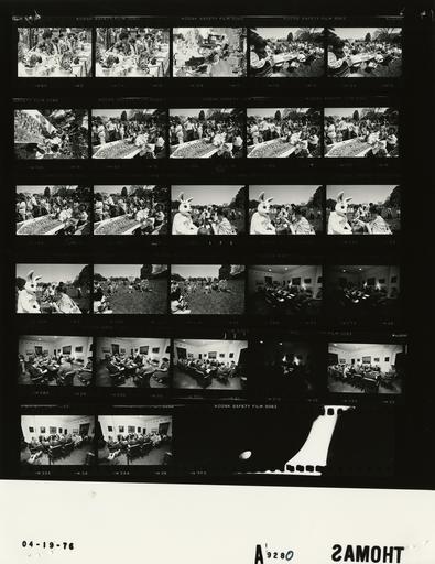 Keywords: Ford A9280 NLGRF photo contact sheet (1976-04-19)(Gerald Ford Library).jpg White House Photographic Office WHPO is housed at the Gerald R Ford Presidential Library a branch of the National Archives and Records Administration NARA <br/><br/> This file is a 200 dpi photo contact sheet having images from roll of film A9280 of the August 9 1974 - January 20 1977 Gerald R Ford White House Photographic Office Series A0001-A9999 and B0001-B2886 photographs <br/><br/> The date on the photo contact sheet is the date the roll of film was processed not necessarily the date the photographs were taken See table below for additional details 1976-04-19 Gerald R Ford Presidential Library Image http //www fordlibrarymuseum gov/library/whphotos/A9280_NLGRF jpg A9280_NLGRF jpg from http //www fordlibrarymuseum gov/library/whphotos/19760419whpo pdf White House Photographs April 19 1976 of the http //www fordlibrarymuseum gov/Library/whphotos/whpo asp White House Photographic Collection page White House Photographic Office WHPO - Thomas PD-USGov Institution Institution Gerald R Ford Presidential Library Table wikitable sortable + Photo contact sheet A9280 U S President Ford Administration Gerald R Ford Library Frame s Tone Subject proper Subject generic Names Geographic Location Photographer Date - 8A-19A BW Annual White House Easter Egg Roll; Ukranian Egg Decorating; Ethnic costumes and dolls visitors on lawn standing at tables where girls in ethnic costumes are performing Ukranian egg decorating; Ukranian dolls Visitors South Lawn Thomas 1976-04-19 - 20A-23A BW Annual White House Easter Egg Roll; Easter Bunny standing together talking holding pen Easter Bunny Children Visitors South Lawn Thomas 1976-04-19 - 24A-25A BW Annual White House Easter Egg Roll Mother and child on grass by sign White House Easter Egg Roll Mothers Children Visitors South Lawn Thomas 1976-04-19 - 26A-34A BW Interview with Editors of Texas' Harte-Hanks Newspapers seated around table GRF Editors; Nessen Roosevelt Room Thomas 1976-04-19 Gerald R Ford Presidential Library and Museum-cooperation PD-USGov Contact sheets by the Ford White House April 1976 |