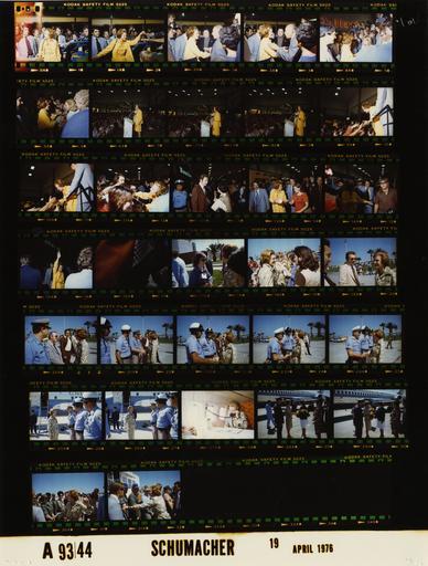 Keywords: Ford A9344 NLGRF photo contact sheet (1976-04-20)(Gerald Ford Library).jpg White House Photographic Office WHPO is housed at the Gerald R Ford Presidential Library a branch of the National Archives and Records Administration NARA <br/><br/> This file is a 200 dpi photo contact sheet having images from roll of film A9344 of the August 9 1974 - January 20 1977 Gerald R Ford White House Photographic Office Series A0001-A9999 and B0001-B2886 photographs <br/><br/> The date on the photo contact sheet is the date the roll of film was processed not necessarily the date the photographs were taken See table below for additional details 1976-04-20 Gerald R Ford Presidential Library Image http //www fordlibrarymuseum gov/library/whphotos/A9344_NLGRF jpg A9344_NLGRF jpg from http //www fordlibrarymuseum gov/library/whphotos/19760420whpo pdf White House Photographs April 20 1976 of the http //www fordlibrarymuseum gov/Library/whphotos/whpo asp White House Photographic Collection page White House Photographic Office WHPO - Schumacher PD-USGov Institution Institution Gerald R Ford Presidential Library Table wikitable sortable + Photo contact sheet A9344 U S President Ford Administration Gerald R Ford Library Frame s Tone Subject proper Subject generic Names Geographic Location Photographer Date - 0A-15A Color First Lady Campaign Trip to Texas-Stopby at Mall to Distribute Campaign Buttons-First Lady Remarks Betty arriving handshaking; making remarks at podium above crowd; handshaking departing Betty Ford Secret Service Crowd Corpus Christi TX Padre Staples Mall Schumacher 1976-04-20 - 16A Color No subject Corpus Christi TX Hilton Inn Schumacher 1976-04-20 - 17A-26A Color First Lady Campaign Trip to Texas-Airport Departure standing talking handshaking on tarmac in front of plane; various angles and distances; all not in every frame Betty Ford Media Unidentified Men Police Officers Corpus Christi TX Corpus Christi International Airport Schumacher 1976-04-21 - 27A Color First Lady Campaign Trip to Texas- Flight from San Antonio to Houston Texs seated at table talking on telephone Betty Ford Aboard C-9 Aircraft Schumacher 1976-04-21 - 28A-29A Color First Lady Campaign Trip to Texas-Airport Arrival standing on tarmac in front of plane presenting yellow roses handshaking; handshaking with men in military uniforms Betty Ford Col Mrs Clifton Rogers Col Mrs G F Marsella Houston TX Ellington AFB Schumacher 1976-04-21 - 30A-31A Color First Lady Campaign Trip to Texas-Airport Arrival greeting handshaking; various angles; all not in both frames Betty Ford Air Force Personnel Others Houston TX Ellington AFB Schumacher 1976-04-21 - 30A-31A Color First Lady Campaign Trip to Texas-Bicentennial Celebration for 140th Anniversary of Battle of San Jacinto and 28th Anniversary of Battleship Presentation to Texas; campaign placards; senior citizens elderly Betty working crowd receiving quilt with gold star; crowd holding signs Hello First Momma Grandpas Like Betty Texas Nursing Home Association Betty Ford Crowd Houston TX San Jacinto Battleground Park Schumacher 1976-04-21 Gerald R Ford Presidential Library and Museum-cooperation PD-USGov Contact sheets by the Ford White House April 1976 |
