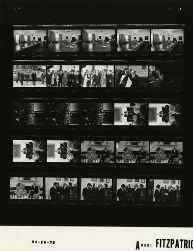Keywords: Ford A9381 NLGRF photo contact sheet (1976-04-24)(Gerald Ford Library).jpg White House Photographic Office WHPO is housed at the Gerald R Ford Presidential Library a branch of the National Archives and Records Administration NARA <br/><br/> This file is a 200 dpi photo contact sheet having images from roll of film A9381 of the August 9 1974 - January 20 1977 Gerald R Ford White House Photographic Office Series A0001-A9999 and B0001-B2886 photographs <br/><br/> The date on the photo contact sheet is the date the roll of film was processed not necessarily the date the photographs were taken See table below for additional details 1976-04-24 Gerald R Ford Presidential Library Image http //www fordlibrarymuseum gov/library/whphotos/A9381_NLGRF jpg A9381_NLGRF jpg from http //www fordlibrarymuseum gov/library/whphotos/19760424whpo pdf White House Photographs April 24 1976 of the http //www fordlibrarymuseum gov/Library/whphotos/whpo asp White House Photographic Collection page White House Photographic Office WHPO - Fitz-Patrick PD-USGov Institution Institution Gerald R Ford Presidential Library Table wikitable sortable + Photo contact sheet A9381 U S President Ford Administration Gerald R Ford Library Frame s Tone Subject proper Subject generic Names Geographic Location Photographer Date - 3-7 BW Defense Briefing to Discuss Soviet Weapons Development; Hughes DepDir for Collection Soviet Military Threat Defense Intelligence Agency DOD seated at table GRF Rumsfeld Marsh Scowcroft Cheney Gen George Brown Hyland; John T Hughes Cabinet Room Fitz-Patrick 1976-04-24 - 8-11 BW Sunday Worship; Midshipmen Choir of US Naval Academy Annapolis MD walking from limousine; walking past choir members with rector handshaking with rector; arriving and departing GRF Betty Ford Secret Service Midshipmen Choir Members Rector John C Harper Washington D C St John's Episcopal Church Fitz-Patrick 1976-04-25 - 12-15 BW 64th Annual Meeting of the US Chamber of Commerce-Remarks GRF at podium onstage with band members seated behind him GRF Audience band Washington D C DAR Constitution Hall Fitz-Patrick 1976-04-26 - 16-19 BW Meeting of Top Level Women In Government-Remarks GRF at podium audience seated in foreground GRF Audience State Dining Room Fitz-Patrick 1976-04-26 - 20-23 BW Meeting with Ambassador-designate of the US to Nepal seated in chairs by fireplace GRF Marquita Maytag Oval Office Fitz-Patrick 1976-04-26 - 24-27 BW Member of White House Press Office Staff handshaking standing talking GRF Unidentified Man Patrick H Butler David W Boorstin Douglas J Smith President's Private Office Fitz-Patrick 1976-04-26 Gerald R Ford Presidential Library and Museum-cooperation PD-USGov Contact sheets by the Ford White House April 1976 |