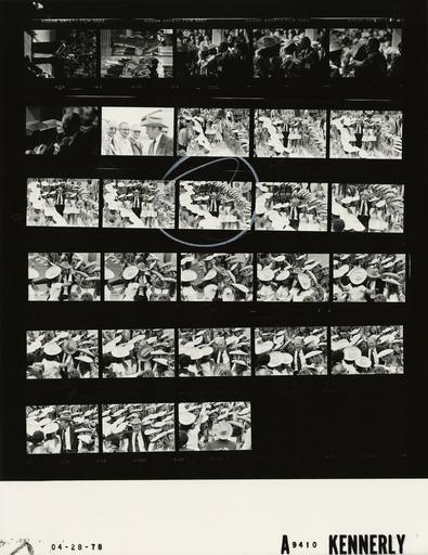 Keywords: Ford A9410 NLGRF photo contact sheet (1976-04-28)(Gerald Ford Library).jpg White House Photographic Office WHPO is housed at the Gerald R Ford Presidential Library a branch of the National Archives and Records Administration NARA <br/><br/> This file is a 200 dpi photo contact sheet having images from roll of film A9410 of the August 9 1974 - January 20 1977 Gerald R Ford White House Photographic Office Series A0001-A9999 and B0001-B2886 photographs <br/><br/> The date on the photo contact sheet is the date the roll of film was processed not necessarily the date the photographs were taken See table below for additional details 1976-04-28 Gerald R Ford Presidential Library Image http //www fordlibrarymuseum gov/library/whphotos/A9410_NLGRF jpg A9410_NLGRF jpg from http //www fordlibrarymuseum gov/library/whphotos/19760428whpo pdf White House Photographs April 28 1976 of the http //www fordlibrarymuseum gov/Library/whphotos/whpo asp White House Photographic Collection page White House Photographic Office WHPO <br/> Creator David Hume Kennerly PD-USGov Institution Institution Gerald R Ford Presidential Library Table wikitable sortable + Photo contact sheet A9410 U S President Ford Administration Gerald R Ford Library Frame s Tone Subject proper Subject generic Names Geographic Location Photographer Date - 2A BW Primary Campaign Trip to Texas; Tyler Junior College Public Forum; Remarks -Tyler Texas standing at podium side view GRF Tyler TX Tyler Junior College Kennerly 1976-04-28 - 3A BW Primary Campaign Trip to Texas; Tyler Junior College Public Forum; Remarks; Apache Belles Dancing Drill Team - Tyler Texas Lukash standing on stage behind line of Apache Bells listening to GRF speech Lukash Apache Belles Tyler TX Tyler Junior College Kennerly 1976-04-28 - 4A-7A BW Primary Campaign Trip to Texas; Departing from Tyler Junior College Public Forum; Apache Belles Dancing Drill Team -Tyler Texas GRF embracing and kissing Apache Belles - GRF wearing cowboy hat GRF Apache Belles Tyler TX Tyler Junior College Kennerly 1976-04-28 - 8A BW Primary Campaign Trip to Texas; Airport Departure - Tyler Texas GRF in cowboy hat greeting local elected and civic leaders and PFC officials on tarmac GRF Unidentified Men Tyler TX Gregg County Airport Kennerly 1976-04-28 - 9A-29A BW Primary Campaign Trip to Texas; Tyler Junior College Apache Belles; Airport Departure - Tyler Texas GRF walks between two rows of Apache Belles arms around four of them; GRF kissing and embracing in a sea of Apache Belles; GRF and girls in cowboy hats GRF Tyler Junior College Apache Belles Secret Service Tyler TX Gregg County Airport Kennerly 1976-04-28 Gerald R Ford Presidential Library and Museum-cooperation PD-USGov Contact sheets by the Ford White House April 1976 Photographs by David Hume Kennerly from 1976 |