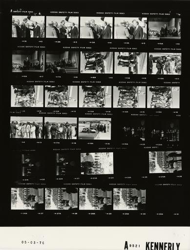 | Keywords: Ford A9521 NLGRF photo contact sheet (1976-05-03)(Gerald Ford Library).jpg White House Photographic Office WHPO is housed at the Gerald R Ford Presidential Library a branch of the National Archives and Records Administration NARA <br/><br/> This file is a 200 dpi photo contact sheet having images from roll of film A9521 of the August 9 1974 - January 20 1977 Gerald R Ford White House Photographic Office Series A0001-A9999 and B0001-B2886 photographs <br/><br/> The date on the photo contact sheet is the date the roll of film was processed not necessarily the date the photographs were taken See table below for additional details 1976-05-03 Gerald R Ford Presidential Library Image http //www fordlibrarymuseum gov/library/whphotos/A9521_NLGRF jpg A9521_NLGRF jpg from http //www fordlibrarymuseum gov/library/whphotos/19760503whpo pdf White House Photographs May 3 1976 of the http //www fordlibrarymuseum gov/Library/whphotos/whpo asp White House Photographic Collection page White House Photographic Office WHPO <br/> Creator David Hume Kennerly PD-USGov Institution Institution Gerald R Ford Presidential Library Table wikitable sortable + Photo contact sheet A9521 U S President Ford Administration Gerald R Ford Library Frame s Tone Subject proper Subject generic Names Geographic Location Photographer Date - 1A-4A BW Trip to Indiana - Arrival at Weir Cook Airport handshaking saying goodbye GRF Others Indianapolis IN Weir Cook Airport Kennerly 1976-05-03 - 5A-7A BW Trip to Indiana - Briefing on General Revenue Sharing GRF at lectern speaking; taken from left of GRF GRF Platfprm Guests Crowd Indianapolis IN Murat Shrine Temple Kennerly 1976-05-03 - 8A-16A BW Trip to Alabama; Airport Arrival; Greetings by Alabama PFC Co-Chairmen; RNC and Republican Executive Committee Officials Jefferson County Republican Chairwoman; US Representative from Alabama AL ; Mother of US Representative - Birmingham Alabama GRF descends ramp greeted by Rep Buchanan and his mother frame 8A-9A ; handshaking on tarmac GRF Rep John Buchanan his mother; Charles Chapman Mildred Anne Lee Mrs V D Lee Mr Mrs Edgar Welden son Mr Mrs William Harris Mr Mrs Perry Hooper Mrs Ira Sullivan son Mrs Michael Putman Michael Putnam Birmingham AL Birmingham Municipal Airport Kennerly 1976-05-03 - 17A BW Trip to Alabama; Airport Arrival; Eagle Scout Presentation; US Representative from Alabama AL - Birmingham Alabama Boy scouts presenting framed item to GRF on tarmac handshaking; all may not be shown GRF Rep John Buchanan Eagle Scouts Robert Walker Danny Smith Mike McKerley Bill Schiesz Doug Adair J Mason Davis Jr ; William C Gamble Dan Ingram Birmingham AL Birmingham Municipal Airport Kennerly 1976-05-03 - 18A BW Trip to Alabama; Airport Departure; US Representative from Alabama AL - Birmingham Alabama GRF and Buchanan standing on tarmac by limousine; USSS standing seated in car behind GRF Rep John Buchanan Secret Service Birmingham AL Birmingham Municipal Airport Kennerly 1976-05-03 - 19A-22A BW Trip to Alabama; Chamber of Commerce Public Forum -Birmingham Alabama GRF at podium; guests standing applauding seated; dark room GRF Platform Guests Birmingham AL Jefferson Civic Center Kennerly 1976-05-03 - 23A-29A BW Trip to Alabamal; Campaign Rally; US Representative from Alabama AL - Birmingham Alabama GRF at podium waving to audience; Buchanan shakes hand frame 25A ; GRF turns tp platform guests waves to camera behind him GRF Rep John Buchanan Platform Guests Audience Birmingham AL Wilson Park Kennerly 1976-05-03 Gerald R Ford Presidential Library and Museum-cooperation PD-USGov Contact sheets by the Ford White House May 1976 Photographs by David Hume Kennerly from 1976 |