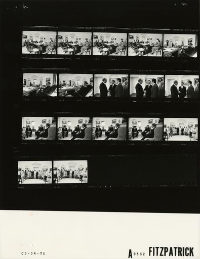 Keywords: Ford A9532 NLGRF photo contact sheet (1976-05-04)(Gerald Ford Library).jpg White House Photographic Office WHPO is housed at the Gerald R Ford Presidential Library a branch of the National Archives and Records Administration NARA <br/><br/> This file is a 200 dpi photo contact sheet having images from roll of film A9532 of the August 9 1974 - January 20 1977 Gerald R Ford White House Photographic Office Series A0001-A9999 and B0001-B2886 photographs <br/><br/> The date on the photo contact sheet is the date the roll of film was processed not necessarily the date the photographs were taken See table below for additional details 1976-05-04 Gerald R Ford Presidential Library Image http //www fordlibrarymuseum gov/library/whphotos/A9532_NLGRF jpg A9532_NLGRF jpg from http //www fordlibrarymuseum gov/library/whphotos/19760504whpo pdf White House Photographs May 4 1976 of the http //www fordlibrarymuseum gov/Library/whphotos/whpo asp White House Photographic Collection page White House Photographic Office WHPO - Fitz-Patrick PD-USGov Institution Institution Gerald R Ford Presidential Library Table wikitable sortable + Photo contact sheet A9532 U S President Ford Administration Gerald R Ford Library Frame s Tone Subject proper Subject generic Names Geographic Location Photographer Date - 4-10 BW Meeting with Secretary of Commerce Elliott L Richardson and Chief of Staff Dick Cheney seated around desk talking; Cheney not in every frame; various angles and distances GRF Elliott Richardson Cheney Oval Office Fitz-Patrick 1976-05-04 - 11-17 BW Meeting to Discuss US-Hungarian Relations; Hungarian People's Republic Deputy Prime Minister its Council for Mutual Economic Assistance CEMA Permanent Representative entering handshaking talking interpreting; GRF and Szeker seated at fireplace talking; interpreter on sofa GRF Gyula Szeker Amb Ferenc Estergalyos; Gyorgy Banlaki Interpreter Oval Office Fitz-Patrick 1976-05-04 - 18-20 BW Meeting with West Virginia Strawberry King and Queen-Photo-Op Queen King family members and Strawberry Festival officials; US Representative from West Virginia WV standing together posing GRF Rep Harley O Staggers Robert Wayne DeVaul Joan Elaine Connolly Mr Mrs Linny Lee Karen Ann Connolly H Gene Starr James Henderson Danny Wayne Lantz Dianne Fessler Marguerite Furfari Oval Office Fitz-Patrick 1976-05-04 Gerald R Ford Presidential Library and Museum-cooperation PD-USGov Contact sheets by the Ford White House May 1976 Strawberry festivals |