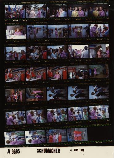 | Keywords: Ford A9695 NLGRF photo contact sheet (1976-04-20)(Gerald Ford Library).jpg White House Photographic Office WHPO is housed at the Gerald R Ford Presidential Library a branch of the National Archives and Records Administration NARA <br/><br/> This file is a 200 dpi photo contact sheet having images from roll of film A9695 of the August 9 1974 - January 20 1977 Gerald R Ford White House Photographic Office Series A0001-A9999 and B0001-B2886 photographs <br/><br/> The date on the photo contact sheet is the date the roll of film was processed not necessarily the date the photographs were taken See table below for additional details 1976-04-20 Gerald R Ford Presidential Library Image http //www fordlibrarymuseum gov/library/whphotos/A9695_NLGRF jpg A9695_NLGRF jpg from http //www fordlibrarymuseum gov/library/whphotos/19760420whpo pdf White House Photographs April 20 1976 of the http //www fordlibrarymuseum gov/Library/whphotos/whpo asp White House Photographic Collection page White House Photographic Office WHPO - Schumacher PD-USGov Institution Institution Gerald R Ford Presidential Library Table wikitable sortable + Photo contact sheet A9695 U S President Ford Administration Gerald R Ford Library Frame s Tone Subject proper Subject generic Names Geographic Location Photographer Date - 18A Color First Lady Campaign Trip to Texas-Visit to PFC Headquarters-Departing from standing waving by doorway Betty Ford Others Harlingen TX President Ford Committee PFC Headquarters Schumacher 1976-04-20 - 19A-21A Color First Lady Campaign Trip to Texas-Visit to Austin Elementary School Bicentennial BF Littleton on stage; handshaking with children on stage holding name cards; children in Bicentennial clothing Betty Ford Vance Littleton Children Harlingen TX Austin Elementary School - Auditorium Schumacher 1976-04-20 - 22A-24A Color First Lady Campaign Trip to Texas-Airport Departure; Bicentennial little boys and girl standing on tarmac wearing banners Dwight Eisenhower Mamie Eisenhower and John Fitzgerald Kennedy Eisenhower wearing military garb Children Harlingen TX Harlingen International Airport Schumacher 1976-04-20 - 25A-31A Color First Lady Campaign Trip to Texas-Airport Departure; Bicentennial BF bending to shake hands with children wearing banners Gerald Ford and Betty Ford; also Patricia Nixon Betty Ford Children Harlingen TX Harlingen International Airport Schumacher 1976-04-20 - 32A-33A Color First Lady Campaign Trip to Texas-Airport Departure; PFC officials standing together posing in front of C-9 Aircraft Betty Ford Unidentified Man 2 women Harlingen TX Harlingen International Airport Schumacher 1976-04-20 - 0A-4A Color First Lady Campaign Trip to Texas -Departing San Antonio handshaking at rope; greeting at curb; posing inside Betty Ford Crowd cub scouts; Unidentified women San Antonio TX San Antonion International Airport Schumacher 1976-04-20 - 5A Color First Lady Campaign Trip to Texas-Aboard C-9 seated on plane pen in hand smiling Betty Ford Enroute McAllen TX Aboard C-9 Schumacher 1976-04-20 - 6A-13A Color First Lady Campaign Trip to Texas-Airport Arrival; Yellow Roses walking from plane receiving yellow roses flowers from Crowe's bending receiving gift from child talking to woman; all may not be shown Betty Ford; Mayor Jack Whetsell Mr Mrs Tommy Beardmore Mrs Trammel Crowe Mrs Edward Wallace The McAllen Chamber of Commerce Greeters Children in patriotic costume Crowd McAllen TX Miller International Airport Schumacher 1976-04-20 - 14A Color First Lady Campaign Trip to Texas-PFC Volunteers Republican Women Picnic Luncheon entering handshaking receiving daisies Betty Ford Unidentified Woman Harlingen TX President Ford Committee PFC Headquarters Schumacher 1976-04-20 - 15A-17A Color First Lady Campaign Trip to Texas-Visit to PFC Headquarters-Making Campaign Call from PFC Telephone Center seated talking on telephone others standing behind; midrange Betty Ford PFC Officials staff Harlingen TX President Ford Committee PFC Headquarters Schumacher 1976-04-20 Gerald R Ford Presidential Library and Museum-cooperation PD-USGov Contact sheets by the Ford White House April 1976 |
