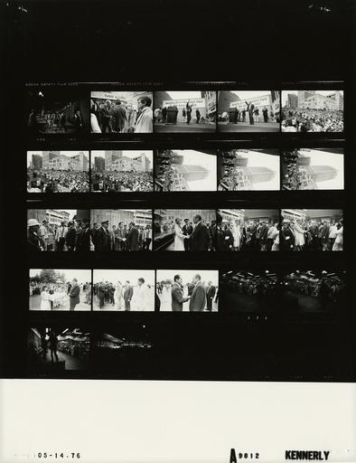 Keywords: Ford A9812 NLGRF photo contact sheet (1976-05-14)(Gerald Ford Library).jpg White House Photographic Office WHPO is housed at the Gerald R Ford Presidential Library a branch of the National Archives and Records Administration NARA <br/><br/> This file is a 200 dpi photo contact sheet having images from roll of film A9812 of the August 9 1974 - January 20 1977 Gerald R Ford White House Photographic Office Series A0001-A9999 and B0001-B2886 photographs <br/><br/> The date on the photo contact sheet is the date the roll of film was processed not necessarily the date the photographs were taken See table below for additional details 1976-05-14 Gerald R Ford Presidential Library Image http //www fordlibrarymuseum gov/library/whphotos/A9812_NLGRF jpg A9812_NLGRF jpg from http //www fordlibrarymuseum gov/library/whphotos/19760514whpo pdf White House Photographs May 14 1976 of the http //www fordlibrarymuseum gov/Library/whphotos/whpo asp White House Photographic Collection page White House Photographic Office WHPO <br/> Creator David Hume Kennerly PD-USGov Institution Institution Gerald R Ford Presidential Library Table wikitable sortable + Photo contact sheet A9812 U S President Ford Administration Gerald R Ford Library Frame s Tone Subject proper Subject generic Names Geographic Location Photographer Date - 2A BW Primary Campaign Trip to Tennessee-Campaign Rally GRF walking onstage Scouts saluting GRF Girl Scouts; Secret Service Crowd Johnson City TN Freedom Hall Convention Center Kennerly 1976-05-14 - 3A-11A BW Primary Campaign Trip to Tennessee; Dedication of Commerce Square Fountain; Remarks; US Senators from Tennessee TN GRF arriving at curb; GRF waving/platform speaking/podium; guests standing applauding/seated; long shots crowd and city buildings; all are not shown GRF Crowd O'Donnell; Sens Howard Baker William Brock Mayor Ron Nixon Mayor Wyeth Chandler James McGehee Wayne Pyeatt Memphis TN Mid-America Mall Kennerly 1976-05-14 - 12A-16A BW Primary Campaign Trip to Tennessee-Dedication of Commerce Square Fountain-Departing from GRF handshaking talking with crowd; hard hats; posing in group with Baker and unidentified men GRF Crowd Secret Service; Sen Howard Baker R-TN Unidentified Men ushers Memphis TN Mid-America Mall Kennerly 1976-05-14 - 17A-19A Color Primary Campaign Trip to Tennessee-Airport Departure; Bicentennial Pillow Presentation by Christ Untied Methodist Day School students children presenting bicentennial pillow; handshaking with motorcade police and dignitaries GRF Children; Secret Service Crowd; Police Dignitaries Memphis TN Memphis International Airport Kennerly 1976-05-14 - 20A-22A BW Primary Campaign Trip to Kentucky; Unidentified - Louisville Kentucky GRF walking by crowd to narrow platform with guests standing applauding GRF Crowd Platform Guests Louisville KY Kentucky Fair and Exposition Center Kennerly 1976-05-14 - 23A BW Primary Campaign Trip to Kentucky; 15th Annual Louisville Armed Forces Day Dinner; Gen Van Stockum Retired USMC - Louisville Kentucky long shot of GRF at podium head guests seated at table darkened audience GRF Gen Richard Frymire Gen Ronald Van Stockum Louisville KY Galt House Hotel Kennerly 1976-05-14 Gerald R Ford Presidential Library and Museum-cooperation PD-USGov Contact sheets by the Ford White House May 1976 Photographs by David Hume Kennerly from 1976 |