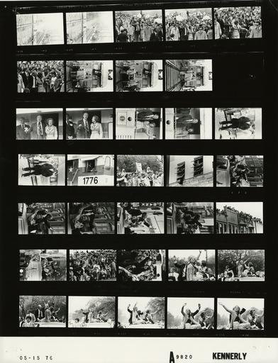 | Keywords: Ford A9820 NLGRF photo contact sheet (1976-05-15)(Gerald Ford Library).jpg White House Photographic Office WHPO is housed at the Gerald R Ford Presidential Library a branch of the National Archives and Records Administration NARA <br/><br/> This file is a 200 dpi photo contact sheet having images from roll of film A9820 of the August 9 1974 - January 20 1977 Gerald R Ford White House Photographic Office Series A0001-A9999 and B0001-B2886 photographs <br/><br/> The date on the photo contact sheet is the date the roll of film was processed not necessarily the date the photographs were taken See table below for additional details 1976-05-15 Gerald R Ford Presidential Library Image http //www fordlibrarymuseum gov/library/whphotos/A9820_NLGRF jpg A9820_NLGRF jpg from http //www fordlibrarymuseum gov/library/whphotos/19760515whpo pdf White House Photographs May 15 1976 of the http //www fordlibrarymuseum gov/Library/whphotos/whpo asp White House Photographic Collection page White House Photographic Office WHPO <br/> Creator David Hume Kennerly PD-USGov Institution Institution Gerald R Ford Presidential Library Table wikitable sortable + Photo contact sheet A9820 U S President Ford Administration Gerald R Ford Library Frame s Tone Subject proper Subject generic Names Geographic Location Photographer Date - 2-15 BW Primary Campaign Whistle-Stop Tour of Michigan-Kalamazoo Remarks GRF/BF walking through crowd standing on caboose; GRF making remarks GRF Betty Ford Secret Service Others Crowd Kalamazoo MI Train Station Kennerly 1976-05-15 - 16-17 BW Primary Campaign Whistle-Stop Tour of Michigan-Kalamazoo Stopover standing on pavement Secret Service Kalamazoo MI Train Station Kennerly 1976-05-15 - 18-20 BW Primary Campaign Whistle-Stop Tour of Michigan GRF seated in train window; crowd with sigh Niles Welcomes the Titanic GRF Crowd Niles MI Train Station Kennerly 1976-05-15 - 21-36 BW Primary Campaign Whistle-Stop Tour of Michigan; 47th Annual Tulip Time Festival Parade; US Representative from Michigan MI BF/GRF waving from sunroof; people on rooftops and on curb; GRF/SF/BF waving from sunroof GRF Betty Ford Secret Service Crowd Rep Guy Vander Jagt Holland MI Streets of Holland Kennerly 1976-05-15 Gerald R Ford Presidential Library and Museum-cooperation PD-USGov Contact sheets by the Ford White House May 1976 Photographs by David Hume Kennerly from 1976 |