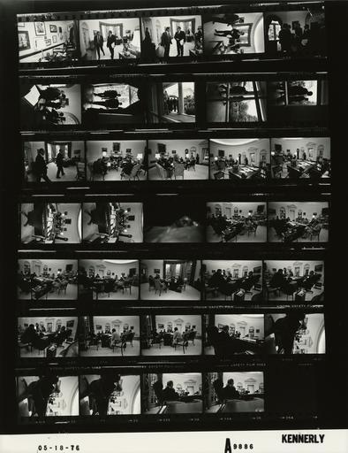 | Keywords: Ford A9886 NLGRF photo contact sheet (1976-05-18)(Gerald Ford Library).jpg White House Photographic Office WHPO is housed at the Gerald R Ford Presidential Library a branch of the National Archives and Records Administration NARA <br/><br/> This file is a 200 dpi photo contact sheet having images from roll of film A9886 of the August 9 1974 - January 20 1977 Gerald R Ford White House Photographic Office Series A0001-A9999 and B0001-B2886 photographs <br/><br/> The date on the photo contact sheet is the date the roll of film was processed not necessarily the date the photographs were taken See table below for additional details 1976-05-18 Gerald R Ford Presidential Library Image http //www fordlibrarymuseum gov/library/whphotos/A9886_NLGRF jpg A9886_NLGRF jpg from http //www fordlibrarymuseum gov/library/whphotos/19760518whpo pdf White House Photographs May 18 1976 of the http //www fordlibrarymuseum gov/Library/whphotos/whpo asp White House Photographic Collection page White House Photographic Office WHPO <br/> Creator David Hume Kennerly PD-USGov Institution Institution Gerald R Ford Presidential Library Table wikitable sortable + Photo contact sheet A9886 U S President Ford Administration Gerald R Ford Library Frame s Tone Subject proper Subject generic Names Geographic Location Photographer Date - 1A BW White House Photo Office framed pictures GRF Kennerly etc and items hanging on wall White House Photo Office Kennerly 1976-05-18 - 2A-4A BW Meeting with Secretary of State Secretary of Defense National Security Affairs Assistant and Chief of Staff-departure from Kissinger and Rumsfeld walking toward door; others at desk Rumsfeld Kissinger; GRF Scowcroft Oval Office Kennerly 1976-05-18 - 5A-6A BW Meeting with Secretary of State Secretary of Defense National Security Affairs Assistant and Chief of Staff; French Foreign Minister Sauvagnargues standing handshaking talking Valery Giscard d'Estaing Jean Sauvagnargues Amb Kosciusko-Morizet Kissinger Cabinet Room Kennerly 1976-05-18 - 7A-10A BW State Visit of French President Valery Giscard d'Estaing-Press Photo Op; French Foreign Minister Sauvagnargues walking through Oval Office door standing between columns press in Garden shooting walking down Colonnade GRF Valery Giscard d'Estaing Jean Sauvagnargues Catto Media Rose Garden/Colonn ade Thomas 1976-05-18 - 11A BW State Visit of French President Valery Giscard d'Estaing-Oval Office Meeting-prior to walking into room GRF Valery Giscard d'Estaing Oval Office Thomas 1976-05-18 - 12A-17A BW State Visit of French President Valery Giscard d'Estaing-Oval Office Meeting; French Foreign Minister Sauvagnargues seated in chairs by fireplace and sofas; view of GRF's desktop with papers on it GRF Valery Giscard d'Estaing Jean Sauvagnargues Kissinger Scowcroft Amb Kenneth Rush Others Oval Office Thomas 1976-05-18 - 18A BW Thomas 1976-05-18 - 19A-34A BW Meeting with BBB O President Jordan and V P Maloney and consultant Penny Schneider; Batton Barton Durstine and Osborn Inc NY advertising firm seated around desk; Cheney talking; Penny in light suit Maloney in dark suit; Jordan talking to GRF; Jordan gesticulating passionate GRF James J Jordan Jr Don Penny Schneider Cheney Raymond J Maloney Jr Oval Office Kennerly 1976-05-18 Gerald R Ford Presidential Library and Museum-cooperation PD-USGov Contact sheets by the Ford White House May 1976 Photographs by David Hume Kennerly from 1976 |