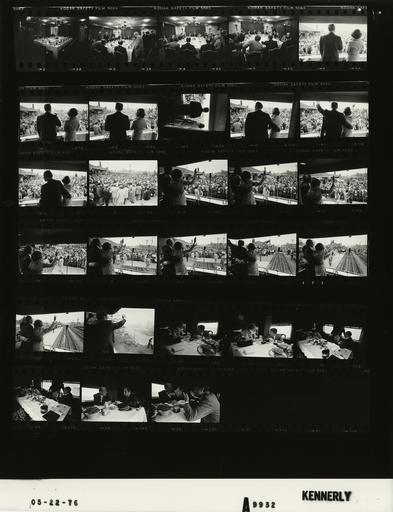 Keywords: Ford A9932 NLGRF photo contact sheet (1976-05-15)(Gerald Ford Library).jpg White House Photographic Office WHPO is housed at the Gerald R Ford Presidential Library a branch of the National Archives and Records Administration NARA <br/><br/> This file is a 200 dpi photo contact sheet having images from roll of film A9932 of the August 9 1974 - January 20 1977 Gerald R Ford White House Photographic Office Series A0001-A9999 and B0001-B2886 photographs <br/><br/> The date on the photo contact sheet is the date the roll of film was processed not necessarily the date the photographs were taken See table below for additional details 1976-05-15 Gerald R Ford Presidential Library Image http //www fordlibrarymuseum gov/library/whphotos/A9932_NLGRF jpg A9932_NLGRF jpg from http //www fordlibrarymuseum gov/library/whphotos/19760515whpo pdf White House Photographs May 15 1976 of the http //www fordlibrarymuseum gov/Library/whphotos/whpo asp White House Photographic Collection page White House Photographic Office WHPO <br/> Creator David Hume Kennerly PD-USGov Institution Institution Gerald R Ford Presidential Library Table wikitable sortable + Photo contact sheet A9932 U S President Ford Administration Gerald R Ford Library Frame s Tone Subject proper Subject generic Names Geographic Location Photographer Date - 2-5 BW Primary Campaign Whistle-Stop Tour of Michigan-Breakfast Interview with Executives of Booth Newspapers of Michigan table set for lunch entering seated at table GRF executives Media Flint MI Holiday Inn-Banquet Room Kennerly 1976-05-15 - 6-23 BW Primary Campaign Whistle-Stop Tour of Michigan-Departing Flint Train Station GRF BF waving to crowd from caboose backs to camera; GRF BF on ground handshaking GRF Betty Ford Crowd Secret Service Media Flint MI Amtrak Rail Passenger Station Kennerly 1976-05-15 - 24-25 BW Primary Campaign Whistle-Stop Tour of Michigan-Aboard Presidential Express; First Lady wearing neck brace BF in neck brace talking to Schneider Betty Ford Don Penny Schneider GRF O'Donnell Others Enroute to Durand or Lansing MI aboard train - dining car Kennerly 1976-05-15 - 26-27 BW Primary Campaign Whistle-Stop Tour of Michigan-Aboard Presidential Express; First Lady wearing neck brace BF in neck brace talking to Schneider; O'Donnell talking to GRF; Detroit Free Press on table Betty Ford Don Penny Schneider GRF O'Donnell Enroute to Durand or Lansing MI aboard train - dining car Kennerly 1976-05-15 - 28 BW Primary Campaign Whistle-Stop Tour of Michigan-Aboard Presidential Express; Press Secretary seated at corner of dining table talking; GRF with coffee cup GRF Nessen Enroute to Durand or Lansing MI aboard train - dining car Kennerly 1976-05-15 - 29 BW Primary Campaign Whistle-Stop Tour of Michigan-Aboard Presidential Express; seated at dining table talking GRF Don Penny Schneider Enroute to Durand or Lansing MI aboard train - dining car Kennerly 1976-05-15 Gerald R Ford Presidential Library and Museum-cooperation PD-USGov Contact sheets by the Ford White House May 1976 Photographs by David Hume Kennerly from 1976 Neck braces