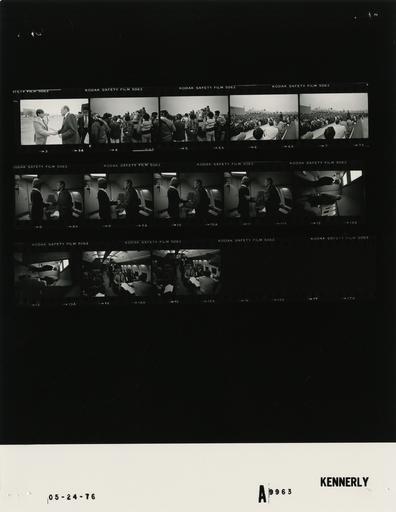 | Keywords: Ford A9963 NLGRF photo contact sheet (1976-05-24)(Gerald Ford Library).jpg White House Photographic Office WHPO is housed at the Gerald R Ford Presidential Library a branch of the National Archives and Records Administration NARA <br/><br/> This file is a 200 dpi photo contact sheet having images from roll of film A9963 of the August 9 1974 - January 20 1977 Gerald R Ford White House Photographic Office Series A0001-A9999 and B0001-B2886 photographs <br/><br/> The date on the photo contact sheet is the date the roll of film was processed not necessarily the date the photographs were taken See table below for additional details 1976-05-24 Gerald R Ford Presidential Library Image http //www fordlibrarymuseum gov/library/whphotos/A9963_NLGRF jpg A9963_NLGRF jpg from http //www fordlibrarymuseum gov/library/whphotos/19760524whpo pdf White House Photographs May 24 1976 of the http //www fordlibrarymuseum gov/Library/whphotos/whpo asp White House Photographic Collection page White House Photographic Office WHPO <br/> Creator David Hume Kennerly PD-USGov Institution Institution Gerald R Ford Presidential Library Table wikitable sortable + Photo contact sheet A9963 U S President Ford Administration Gerald R Ford Library Frame s Tone Subject proper Subject generic Names Geographic Location Photographer Date - 3 BW Trip to California; Airport Arrival - Van Nuys California handshaking on tarmac GRF Unidentified Man O'Donnell Van Nuys CA Van Nuys Airport Kennerly 1976-05-24 - 15A-19A BW Trip to California; Van Nuys Campaign Rally; Scouts -Van Nuys California GRF at podium press shooting crowd standing behind rope; platform guests seated; all may not be shown GRF Media Crowd Scouts; Lithgow Sue Kelley Ted Pierce Johnny Grant Alice Ogle Rosemary Ferraro Hon Mrs Evelle Younger Rep Barry Goldwater Paul Priolo Leon Parma Van Nuys CA Van Nuys Airport Kennerly 1976-05-24 - 8-13 BW Trip to California; Aboard Air Force One; Candice Bergen's Brother -Van Nuys California standing talking GRF Kris Bergen Van Nuys CA enroute Los Angeles International Airport Air Force One Kennerly 1976-05-24 - 14-15 BW Trip to California; Aboard Air Force One; Candice Bergen's Brother -Van Nuys California Bergen standing behind seats of others Kris Bergen Cheney Raoul-Duval Nessen Van Nuys CA enroute Los Angeles International Airport Air Force One Kennerly 1976-05-24 Gerald R Ford Presidential Library and Museum-cooperation PD-USGov Contact sheets by the Ford White House May 1976 Photographs by David Hume Kennerly from 1976 |