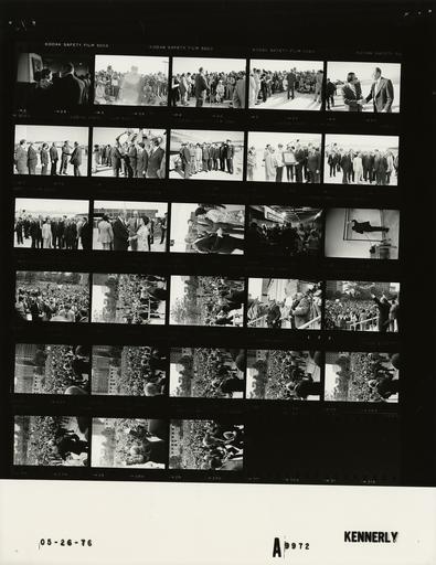 Keywords: Ford A9972 NLGRF photo contact sheet (1976-05-26)(Gerald Ford Library).jpg White House Photographic Office WHPO is housed at the Gerald R Ford Presidential Library a branch of the National Archives and Records Administration NARA <br/><br/> This file is a 200 dpi photo contact sheet having images from roll of film A9972 of the August 9 1974 - January 20 1977 Gerald R Ford White House Photographic Office Series A0001-A9999 and B0001-B2886 photographs <br/><br/> The date on the photo contact sheet is the date the roll of film was processed not necessarily the date the photographs were taken See table below for additional details 1976-05-26 Gerald R Ford Presidential Library Image http //www fordlibrarymuseum gov/library/whphotos/A9972_NLGRF jpg A9972_NLGRF jpg from http //www fordlibrarymuseum gov/library/whphotos/19760526whpo pdf White House Photographs May 26 1976 of the http //www fordlibrarymuseum gov/Library/whphotos/whpo asp White House Photographic Collection page White House Photographic Office WHPO <br/> Creator David Hume Kennerly PD-USGov Institution Institution Gerald R Ford Presidential Library Table wikitable sortable + Photo contact sheet A9972 U S President Ford Administration Gerald R Ford Library Frame s Tone Subject proper Subject generic Names Geographic Location Photographer Date - 2A BW Trip to California; Photo Op with Santa Clara County March of Dimes Poster Child Garrett - San Jose California standing with backs to camera GRF Paul Garrett San Jose CA Holiday Inn Kennerly 1976-05-26 - 3A-5A BW Trip to California; Airport Press Q A Session - San Jose California GRF standing at mike in front of roped in press; press shooting GRF Media San Jose CA San Jose Municipal Airport Kennerly 1976-05-26 - 6A-14A BW Trip to Ohio-Airport Arrival handshaking on tarmac; posing as group; presenting framed portrait plaque; all may not be shown GRF GRF Gov James A Rhodes Mayor Tom Moody Reps Harsha Clarence Brown Devine Wylie Kent McGough Keith McNamara Ray Bliss Columbus OH Port Columbus Airport Kennerly 1976-05-26 - 15A BW Trip to Ohio-Annual Ohio Governor's Conference on Aging-Arrival entering handshaking; back to camera GRF Audience Columbus OH Ohio State Fairgrounds Kennerly 1976-05-26 - 16A BW Trip to Ohio-Annual Ohio Governor's Conference on Aging standing talking on phone; back to camera Unidentified staff Columbus OH Ohio State Fairgrounds Kennerly 1976-05-26 - 17A-29A BW Trip to Ohio-Ohio State Capitol Visit-Remarks; Presentation of Signed Football by Ohio State University Coach Woody Hayes GRF with crowd arriving and departing with football in hand; Rhodes at microphone Woody Hayes holding football GRF Crowd Media Gov James Rhodes Woody Hayes Columbus OH Ohio State Capitol Kennerly 1976-05-26 Gerald R Ford Presidential Library and Museum-cooperation PD-USGov Contact sheets by the Ford White House May 1976 Photographs by David Hume Kennerly from 1976 |
