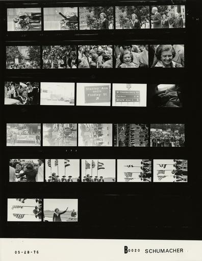 | Keywords: Ford B0020 NLGRF photo contact sheet (1976-05-28)(Gerald Ford Library).jpg White House Photographic Office WHPO is housed at the Gerald R Ford Presidential Library a branch of the National Archives and Records Administration NARA <br/><br/> This file is a 200 dpi photo contact sheet having images from roll of film B0020 of the August 9 1974 - January 20 1977 Gerald R Ford White House Photographic Office Series A0001-A9999 and B0001-B2886 photographs <br/><br/> The date on the photo contact sheet is the date the roll of film was processed not necessarily the date the photographs were taken See table below for additional details 1976-05-28 Gerald R Ford Presidential Library Image http //www fordlibrarymuseum gov/library/whphotos/B0020_NLGRF jpg B0020_NLGRF jpg from http //www fordlibrarymuseum gov/library/whphotos/19760528whpo pdf White House Photographs May 28 1976 of the http //www fordlibrarymuseum gov/Library/whphotos/whpo asp White House Photographic Collection page White House Photographic Office WHPO - Schumacher PD-USGov Institution Institution Gerald R Ford Presidential Library Table wikitable sortable + Photo contact sheet B0020 U S President Ford Administration Gerald R Ford Library Frame s Tone Subject proper Subject generic Names Geographic Location Photographer Date - 4A-5A BW First Lady's Campaign Trip to Ohio - Campaign Rally at Courthouse Square Dayton OH standing talking near microphone; holding bouquet of roses; waving in frame 5A Betty Ford Others Dayton OH Courthouse Square Schumacher 1976-05-28 - 6A-7A BW First Lady's Campaign Trip to Ohio - Campaign Rally at Courthouse Square Dayton OH standing talking near microphone; others in background; close up Betty Ford Others Dayton OH Courthouse Square Schumacher 1976-05-28 - 8A BW First Lady's Campaign Trip to Ohio - Campaign Rally at Courthouse Square Dayton OH - US Representative from Ohio Whalen standing talking into microphone; others in background Betty Ford Rep Whalen Others Dayton OH Courthouse Square Schumacher 1976-05-28 - 9A-10A BW First Lady's Campaign Trip to Ohio - Campaign Rally at Courthouse Square Dayton OH standing listening; sign reading Shmucks for Ford in frame 9A; various angles and distances; all not in every frame Crowd Dayton OH Courthouse Square Schumacher 1976-05-28 - 11A-14A BW First Lady's Campaign Trip to Ohio - Campaign Rally at Courthouse Square Dayton OH greeting handshaking; various distances; all not in every frame; BF close-up in 13A Betty Ford Secret Service Crowd Dayton OH Courthouse Square Schumacher 1976-05-28 - 15A-17A BW First Lady's Campaign Trip to Ohio - Motorcade from Dayton OH to Wright-Patterson Air Force Base motorcade; road signs Fairborn OH Interstate I-675 Schumacher 1976-05-28 - 18A BW First Lady's Campaign Trip to Ohio - Flight from Wright-Patterson Air Force Base to Findlay Municipal Airport Findlay Ohio seated smiling close up Unidentified staff Woman C-9 Jetstar Aircraft Schumacher 1976-05-28 - 19A-20A BW First Lady's Campaign Trip to Ohio - Arrival at Findlay Municipal Airport Findlay Ohio standing behind Findlay Ohio Flag City sign likely taken out C-9 Jetstar Aircraft window Crowd Findlay OH Findlay Municipal Airport Schumacher 1976-05-28 - 21A-22A BW First Lady's Campaign Trip to Ohio - Arrival Ceremony at Findlay Municipal Airport Findlay Ohio Color Guard in foreground; others in background Revolutionary War Color Guard Others Findlay OH Findlay Municipal Airport Schumacher 1976-05-28 - 23A BW First Lady's Campaign Trip to Ohio - Arrival Ceremony at Findlay Municipal Airport Findlay Ohio standing behind rope Crowd Findlay OH Findlay Municipal Airport Schumacher 1976-05-28 - 24A BW First Lady's Campaign Trip to Ohio - Arrival Ceremony at Findlay Municipal Airport Findlay Ohio greeting handshaking; BF's back to camera; all not in frame Betty Ford Crowd Findlay OH Findlay Municipal Airport Schumacher 1976-05-28 - 25A-29A BW First Lady's Campaign Trip to Ohio - Arrival Ceremony at Findlay Municipal Airport Findlay Ohio BF standing at microphone speaking; Color Guard in background Betty Ford Revolutionary War Color Guard Findlay OH Findlay Municipal Airport Schumacher 1976-05-28 - 30A BW First Lady's Campaign Trip to Ohio - Prior to Departure from Findlay Municipal Airport Findlay Ohio for Downtown Fundlay OH standing waving; prior to motorcade; car on right Betty Ford Findlay OH Findlay Municipal Airport Schumacher 1976-05-28 Gerald R Ford Presidential Library and Museum-cooperation PD-USGov Contact sheets by the Ford White House May 1976 |