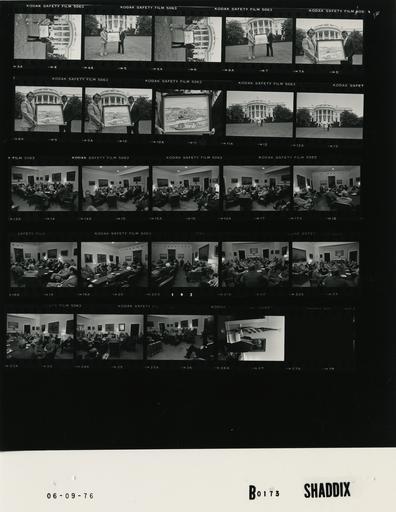 | Keywords: Ford B0173 NLGRF photo contact sheet (1976-06-09)(Gerald Ford Library).jpg White House Photographic Office WHPO is housed at the Gerald R Ford Presidential Library a branch of the National Archives and Records Administration NARA <br/><br/> This file is a 200 dpi photo contact sheet having images from roll of film B0173 of the August 9 1974 - January 20 1977 Gerald R Ford White House Photographic Office Series A0001-A9999 and B0001-B2886 photographs <br/><br/> The date on the photo contact sheet is the date the roll of film was processed not necessarily the date the photographs were taken See table below for additional details 1976-06-09 Gerald R Ford Presidential Library Image http //www fordlibrarymuseum gov/library/whphotos/B0173_NLGRF jpg B0173_NLGRF jpg from http //www fordlibrarymuseum gov/library/whphotos/19760609whpo pdf White House Photographs June 9 1976 of the http //www fordlibrarymuseum gov/Library/whphotos/whpo asp White House Photographic Collection page White House Photographic Office WHPO - Shaddix PD-USGov Institution Institution Gerald R Ford Presidential Library Table wikitable sortable + Photo contact sheet B0173 U S President Ford Administration Gerald R Ford Library Frame s Tone Subject proper Subject generic Names Geographic Location Photographer Date - 4-10 B Bicentennial Gift Presentation - Painting by the Grandson of Grandma Moses standing posing holding painting; various distances; White House and Truman Balcony in background Kuropas Grandma Moses' Grandson South Lawn Shaddix 1976-06-09 - 11 Color Bicentennial Gift Presentation - Painting by the Grandson of Grandma Moses close up of painting South Lawn Shaddix 1976-06-09 - 12-13 B Bicentennial Gift Presentation - Painting by the Grandson of Grandma Moses standing posing holding painting; long shots; White House and Truman Balcony in background Kuropas Grandma Moses' Grandson South Lawn Shaddix 1976-06-09 - 14-26 B Unidentified Meeting in White House seated around table; various angles and distances; all not in every frame Unidentified Group Roosevelt Room Shaddix 1976-06-09 - 27 B Unidentified Meeting in White House standing posing holding documents; flag and portrait of John Adams in background Unidentified Man Unidentified Room Shaddix 1976-06-09 Gerald R Ford Presidential Library and Museum-cooperation PD-USGov Contact sheets by the Ford White House June 1976 |