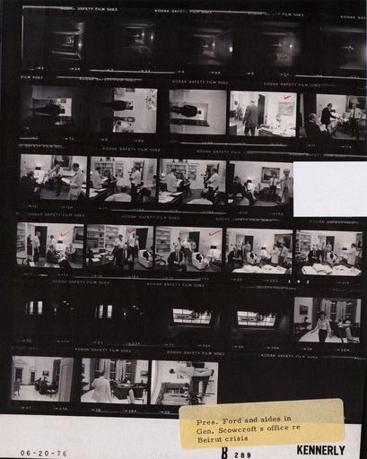 | Keywords: Ford B0289 NLGRF photo contact sheet (1976-06-20)(Gerald Ford Library).jpg White House Photographic Office WHPO is housed at the Gerald R Ford Presidential Library a branch of the National Archives and Records Administration NARA <br/><br/> This file is a 200 dpi photo contact sheet having images from roll of film B0289 of the August 9 1974 - January 20 1977 Gerald R Ford White House Photographic Office Series A0001-A9999 and B0001-B2886 photographs <br/><br/> The date on the photo contact sheet is the date the roll of film was processed not necessarily the date the photographs were taken See table below for additional details 1976-06-20 Gerald R Ford Presidential Library Image http //www fordlibrarymuseum gov/library/whphotos/B0289_NLGRF jpg B0289_NLGRF jpg from http //www fordlibrarymuseum gov/library/whphotos/19760620whpo pdf White House Photographs June 20 1976 of the http //www fordlibrarymuseum gov/Library/whphotos/whpo asp White House Photographic Collection page White House Photographic Office WHPO <br/> Creator David Hume Kennerly PD-USGov Institution Institution Gerald R Ford Presidential Library Table wikitable sortable + Photo contact sheet B0289 U S President Ford Administration Gerald R Ford Library Frame s Tone Subject proper Subject generic Names Geographic Location Photographer Date - 2-6 B Beirut Lebanon Crisis - Walking to Scowcroft's Office walking; moving away from camera; backs to camera; night shot GRF Others Colonnade Kennerly 1976-06-20 - 7-9 B Beirut Lebanon Crisis - Walking to Scowcroft's Office GRF walking into through and out lobby carrying papers under arm; back to camera; FPO in standing at desk in 2nd frame GRF Federal Protective Officer FPO West Wing Lobby Kennerly 1976-06-20 - 10 B Beirut Lebanon Crisis - Walking to Scowcroft's Office for Late Night Meeting with National Security Adviser and Senior Staff Regarding the Crisis in Beirut Lebanon GRF entering Scowcroft's office; secretary seated at desk on right of frame talking telephone; Nessen rising from chair in background GRF Scowcroft's Secretary; Nessen Scowcroft's Office - Outside Kennerly 1976-06-20 - 11-14 B Beirut Lebanon Crisis - Late Night Meeting with National Security Adviser and Senior Staff Regarding the Crisis in Beirut Lebanon GRF Cheney Nessen and Schmults seated; others standing; nearly all looking at reading documents; various angles and distances; all not in every frame; Nessen's back to camera GRF Schmults Nessen Scowcroft Marsh Cheney Hyland Scowcroft's Office Kennerly 1976-06-20 - 15 B Beirut Lebanon Crisis - Late Night Meeting with National Security Adviser and Senior Staff Regarding the Crisis in Beirut Lebanon Marsh and Scowcroft standing others seated; all looking toward Scowcroft who is pointing at photo on easel not seen GRF Schmults Scowcroft Marsh Cheney Scowcroft's Office Kennerly 1976-06-20 - 16 B REDACTED Kennerly 1976-06-20 - 17 B Beirut Lebanon Crisis - Late Night Meeting with National Security Adviser and Senior Staff Regarding the Crisis in Beirut Lebanon GRF seated in foreground reading document; Marsh and Secretary standing behind GRF; Cheney seated behind GRF; Schmults seated on sofa on right; Hyland in background in adjacent room GRF Cheney Marsh Schmults Scowcroft's Secretary; Hyland Scowcroft's Office Kennerly 1976-06-20 - 18 B Beirut Lebanon Crisis - Late Night Meeting with National Security Adviser and Senior Staff Regarding the Crisis in Beirut Lebanon GRF seated in foreground ; Marsh and Secretary standing behind GRF; Cheney seated beside GRF GRF Cheney Marsh Scowcroft's Secretary Scowcroft's Office Kennerly 1976-06-20 - 19 B Beirut Lebanon Crisis - Late Night Meeting with National Security Adviser and Senior Staff Regarding the Crisis in Beirut Lebanon GRF seated in foreground; Marsh and Secretary standing behind GRF; Cheney seated beside GRF; McFarlane in doorway looking at document GRF Cheney Marsh Schmults Scowcroft's Secretary Bud McFarlane Scowcroft's Office Kennerly 1976-06-20 - 20-21 B Beirut Lebanon Crisis - Late Night Meeting with National Security Adviser and Senior Staff Regarding the Crisis in Beirut Lebanon GRF seated in foreground; Marsh and Secretary standing behind GRF; Cheney seated beside GRF; McFarlane in doorway; Scowcroft and Nessen on right of frame; Scowcroft speaking; all looking toward Scowcroft GRF Cheney Marsh Schmults Scowcroft's Secretary Bud McFarlane Scocroft Nessen Scowcroft's Office Kennerly 1976-06-20 - 22-23 B Beirut Lebanon Crisis Oval Office visible through two lighted windows; night shots Oval Office - Outside Kennerly 1976-06-20 - 24-25 B Beirut Lebanon Crisis seated at desk working; looking through window from outside; night shots GRF Oval Office - Outside Kennerly 1976-06-20 - 26 B Beirut Lebanon Crisis GRF and Cheney seated at desk in background; woman in foreground moving toward camera GRF Cheney Unidentified Secretary Oval Office Kennerly 1976-06-20 - 27 B Beirut Lebanon Crisis seated at desk; taken from doorway to Scheduling and Advanve Office GRF Cheney Oval Office Kennerly 1976-06-20 - 28 B Beirut Lebanon Crisis Scowcroft in foreground; walking toward GRF; back to camera; GRF seated at desk GRF Scowcroft Oval Office Kennerly 1976-06-20 - 29 B Beirut Lebanon Crisis Scowcroft standing back to camera; GRF seated at desk GRF Scowcroft Oval Office Kennerly 1976-06-20 Gerald R Ford Presidential Library and Museum-cooperation PD-USGov Contact sheets by the Ford White House June 1976 Photographs by David Hume Kennerly from 1976 |