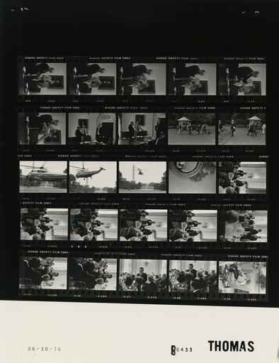 Keywords: Ford B0433 NLGRF photo contact sheet (1976-06-21)(Gerald Ford Library).jpg White House Photographic Office WHPO is housed at the Gerald R Ford Presidential Library a branch of the National Archives and Records Administration NARA <br/><br/> This file is a 200 dpi photo contact sheet having images from roll of film B0433 of the August 9 1974 - January 20 1977 Gerald R Ford White House Photographic Office Series A0001-A9999 and B0001-B2886 photographs <br/><br/> The date on the photo contact sheet is the date the roll of film was processed not necessarily the date the photographs were taken See table below for additional details 1976-06-21 Gerald R Ford Presidential Library Image http //www fordlibrarymuseum gov/library/whphotos/B0433_NLGRF jpg B0433_NLGRF jpg from http //www fordlibrarymuseum gov/library/whphotos/19760621whpo pdf White House Photographs June 21 1976 of the http //www fordlibrarymuseum gov/Library/whphotos/whpo asp White House Photographic Collection page White House Photographic Office WHPO - Thomas PD-USGov Institution Institution Gerald R Ford Presidential Library Table wikitable sortable + Photo contact sheet B0433 U S President Ford Administration Gerald R Ford Library Frame s Tone Subject proper Subject generic Names Geographic Location Photographer Date - 5A-10A BW Following Meeting with Members of Congress to Discuss School Desegregation standing near table looking at document Levy is holding Cannon Levi Cabinet Room Thomas 1976-06-21 - 11A-12A BW Following Meeting with Members of Congress to Discuss School Desegregation - Deputy Counsel standing talking near table Cannon Levi Cabinet Room Thomas 1976-06-21 - 13A-14A BW Prior to Departure for Andrews Air Force Base for Flight to Dorado Beach Puerto Rico walking toward Marine One copter not seen ; guard shack in background GRF Kennerly O'Donnell Secret Service Military Aide South Driveway Thomas 1976-06-26 - 15A-17A BW Departure for Andrews Air Force Base for Flight to Dorado Beach Puerto Rico Marine One ascending; Washington Monument visible beyond copter South Lawn Thomas 1976-06-26 - 18A BW Luncheon in Honor of the Prime Minister of Japan mirrored wall sconce State Dining Room Thomas 1976-06-30 - 19A-24A BW Luncheon in Honor of the Prime Minister of Japan; Interpreter Yanazaki GRF standing making remarks; all guests not in frames GRF Takeo Miki; Head Table Guests Ryichiro Yanazaki; guests State Dining Room Thomas 1976-06-30 - 25A-28A BW Luncheon in Honor of the Prime Minister of Japan; Interpreter Yanazaki Miki standing making remarks; all guests not in frames GRF Takeo Miki; Head Table Guests Ryichiro Yanazaki; guests State Dining Room Thomas 1976-06-30 - 29A BW Taping Audio-visual Bicentennial Message for National Broadcas seated in wing chair; watching taping Unidentified Boy Oval Office Thomas 1976-06-30 Gerald R Ford Presidential Library and Museum-cooperation PD-USGov Contact sheets by the Ford White House June 1976 |