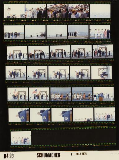 Keywords: Ford B0493 NLGRF photo contact sheet (1976-07-04)(Gerald Ford Library).jpg White House Photographic Office WHPO is housed at the Gerald R Ford Presidential Library a branch of the National Archives and Records Administration NARA <br/><br/> This file is a 200 dpi photo contact sheet having images from roll of film B0493 of the August 9 1974 - January 20 1977 Gerald R Ford White House Photographic Office Series A0001-A9999 and B0001-B2886 photographs <br/><br/> The date on the photo contact sheet is the date the roll of film was processed not necessarily the date the photographs were taken See table below for additional details 1976-07-04 Gerald R Ford Presidential Library Image http //www fordlibrarymuseum gov/library/whphotos/B0493_NLGRF jpg B0493_NLGRF jpg from http //www fordlibrarymuseum gov/library/whphotos/19760704whpo pdf White House Photographs July 4 1976 of the http //www fordlibrarymuseum gov/Library/whphotos/whpo asp White House Photographic Collection page White House Photographic Office WHPO - Schumacher PD-USGov Institution Institution Gerald R Ford Presidential Library Table wikitable sortable + Photo contact sheet B0493 U S President Ford Administration Gerald R Ford Library Frame s Tone Subject proper Subject generic Names Geographic Location Photographer Date - 1-4 Color 4th of July Bicentennial Event - Prior to Arrival of GRF on the USS Forrestal CV-59 greeting handshaking standing talking; various angles and distances; all not in every frame Betty Ford Naval Personnel guests New York Harbor New York City NY USS Forrestal CV-59 - Flight Deck Schumacher 1976-07-04 - 5 Color 4th of July Bicentennial Event - Prior to Arrival of GRF on the USS Forrestal CV-59 ships in harbor near USS Forrestal New York Harbor New York City NY USS Forrestal CV-59 - Flight Deck Schumacher 1976-07-04 - 6 Color 4th of July Bicentennial Event - Prior to Arrival of GRF on the USS Forrestal CV-59 walking across flight deck Media Photographers New York Harbor New York City NY USS Forrestal CV-59 - Flight Deck Schumacher 1976-07-04 - 7 Color 4th of July Bicentennial Event - Arrival on Deck of USS Forrestal CV-59 - Operation Sail; Commander US Navy North Atlantic Fleet; Captain USS Forrestal greeting handshaking near Marine One; copter on right of frame GRF Adm Isaac Kidd Capt Joseph Barth Others New York Harbor New York City NY USS Forrestal CV-59 - Flight Deck Schumacher 1976-07-04 - 8-9 Color 4th of July Bicentennial Event - Arrival on Deck of USS Forrestal CV-59 - Operation Sail; Commander US Navy North Atlantic Fleet; Captain USS Forrestal walking across flight deck; various distances GRF Adm Isaac Kidd Capt Joseph Barth Others New York Harbor New York City NY USS Forrestal CV-59 - Flight Deck Schumacher 1976-07-04 - 10 Color 4th of July Bicentennial Event - Ringing of the Bicentennial Bell on the Flight Deck of the USS Forrestal CV-59 ; Commander US Navy North Atlantic Fleet; Captain USS Forrestal; Secretary of the Navy standing in line Betty Ford Adm Isaac Kidd Capt Joseph Barth Sec Mrs J William Middendorf New York Harbor New York City NY USS Forrestal CV-59 - Flight Deck Schumacher 1976-07-04 - 11-20 Color 4th of July Bicentennial Event - Ringing of the Bicentennial Bell on the Flight Deck of the USS Forrestal CV-59 ; Administrator American Revolution Bicentennial Administration ARBA ; Captain USS Forrestal GRF and Warner standing next to Bicentennial Bell; GRF ringing bell; others standing to side or in background; all not in every frame GRF John Warner Capt Joseph Barth; Naval Marine Personnel New York Harbor New York City NY USS Forrestal CV-59 - Flight Deck Schumacher 1976-07-04 - 21-22 Color 4th of July Bicentennial Event - Ringing of the Bicentennial Bell on the Flight Deck of the USS Forrestal CV-59 ; Captain USS Forrestal Barth standing next to Bicentennial Bell; others in background; all not in both frames Capt Joseph Barth; Naval Marine Personnel New York Harbor New York City NY USS Forrestal CV-59 - Flight Deck Schumacher 1976-07-04 - 23-24 Color 4th of July Bicentennial Event - President's Remarks Following Ringing of the Bicentennial Bell on the Flight Deck of the USS Forrestal CV59 ; Commander US Navy North Atlantic Fleet; Captain USS Forrestal seated listening to GRF's remarks Betty Ford Adm Isaac Kidd Capt Joseph Barth Mrs J William Middendorf Susan Ford New York Harbor New York City NY USS Forrestal CV-59 - Flight Deck Schumacher 1976-07-04 - 25-28 Color 4th of July Bicentennial Event - President's Remarks Following Ringing of the Bicentennial Bell on the Flight Deck of the USS Forrestal CV59 speaking at lectern; taken from low vantage point GRF New York Harbor New York City NY USS Forrestal CV-59 - Flight Deck Schumacher 1976-07-04 - 29-31 Color 4th of July Bicentennial Event - President's Remarks Following Ringing of the Bicentennial Bell on the Flight Deck of the USS Forrestal CV59 ; Commander US Navy North Atlantic Fleet; Captain USS Forrestal seated listening to GRF's remarks Betty Ford Adm Isaac Kidd Capt Joseph Barth Sec Mrs J William Middendorf Susan Ford New York Harbor New York City NY USS Forrestal CV-59 - Flight Deck Schumacher 1976-07-04 Gerald R Ford Presidential Library and Museum-cooperation PD-USGov Contact sheets by the Ford White House July 1976 |