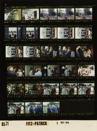 | Keywords: Ford B0521 NLGRF photo contact sheet (1976-07-05)(Gerald Ford Library).jpg White House Photographic Office WHPO is housed at the Gerald R Ford Presidential Library a branch of the National Archives and Records Administration NARA <br/><br/> This file is a 200 dpi photo contact sheet having images from roll of film B0521 of the August 9 1974 - January 20 1977 Gerald R Ford White House Photographic Office Series A0001-A9999 and B0001-B2886 photographs <br/><br/> The date on the photo contact sheet is the date the roll of film was processed not necessarily the date the photographs were taken See table below for additional details 1976-07-05 Gerald R Ford Presidential Library Image http //www fordlibrarymuseum gov/library/whphotos/B0521_NLGRF jpg B0521_NLGRF jpg from http //www fordlibrarymuseum gov/library/whphotos/19760705whpo pdf White House Photographs July 5 1976 of the http //www fordlibrarymuseum gov/Library/whphotos/whpo asp White House Photographic Collection page White House Photographic Office WHPO - Fitz-Patrick PD-USGov Institution Institution Gerald R Ford Presidential Library Table wikitable sortable + Photo contact sheet B0521 U S President Ford Administration Gerald R Ford Library Frame s Tone Subject proper Subject generic Names Geographic Location Photographer Date - 1 Color Trip to Virginia - Arrival for Naturalization Ceremony at Monticello Home of Former President Thomas Jefferson; Chairman Thomas Jefferson Foundation walking talking approaching Monticello not seen and camera; taken from left of sidewalk GRF Mr Mrs Frederick Nolting Albemarle County VA Monticello Fitz-Patrick 1976-07-05 - 2 Color Trip to Virginia - Naturalization Ceremony at Monticello Home of Former President Thomas Jefferson Nessen and man standing near desk man on telephone; woman seated at desk; Wash Room sign on wall on right Nessen Unidentified Man Unidentified Woman Albemarle County VA Monticello - Unidentified Room Fitz-Patrick 1976-07-05 - 3-5 Color Trip to Virginia - Arrival for Naturalization Ceremony at Monticello Home of Former President Thomas Jefferson GRF at lectern speaking; crowd in foreground; long shots from left of crowd; Monticello in background GRF Platform Guests Crowd Albemarle County VA Monticello Fitz-Patrick 1976-07-05 - 6-7 Color Trip to Virginia - Naturalization Ceremony at Monticello Home of Former President Thomas Jefferson GRF at lectern speaking back to camera; crowd in background; taken through doorway from inside Monticello GRF Crowd Albemarle County VA Monticello Fitz-Patrick 1976-07-05 - 8-12 Color Trip to Virginia - Arrival for Naturalization Ceremony at Monticello Home of Former President Thomas Jefferson GRF at lectern speaking; crowd in foreground; medium range shot taken down center aisle; Monticello in background GRF Platform Guests Crowd Albemarle County VA Monticello Fitz-Patrick 1976-07-05 - 13-19 Color Trip to Virginia - Reception for Dignitaries and Platform Guests Following Naturalization Ceremony at Monticello Home of Former President Thomas Jefferson greeting handshaking standing talking; various angles and distances; all not in every frame GRF Unidentified Guests Albemarle County VA Monticello - Unidentified Room Fitz-Patrick 1976-07-05 - 20 Color Trip to Virginia - Following Naturalization Ceremony at Monticello Home of Former President Thomas Jefferson GRF and women greeting handshaking; GRF obscured by agent GRF Unidentified women Secret Service Albemarle County VA Monticello Fitz-Patrick 1976-07-05 - 21-22 Color Trip to Virginia - Following Naturalization Ceremony at Monticello Home of Former President Thomas Jefferson; Governor and Senator from Virginia; Administrator American Revolution Bicentennial Administration ARBA standing by fence surrounding Thomas Jefferson gravesite; looking at gravesite; backs to camera; long shot GRF Gov Mills Godwin Sen Harry F Byrd John Warner Supreme Court Justice Lewis F Powell Albemarle County VA Monticello Fitz-Patrick 1976-07-05 - 23-26 Color Trip to Virginia - Following Naturalization Ceremony at Monticello Home of Former President Thomas Jefferson greeting handshaking standing talking; GRF receiving basket of peaches; all not in every frame GRF Unidentified Group Albemarle County VA Monticello Fitz-Patrick 1976-07-05 - 27-28 Color Trip to Virginia - Following Naturalization Ceremony at Monticello Home of Former President Thomas Jefferson handshaking saying goodbye GRF Others Albemarle County VA Monticello Fitz-Patrick 1976-07-05 Gerald R Ford Presidential Library and Museum-cooperation PD-USGov Contact sheets by the Ford White House July 1976 |