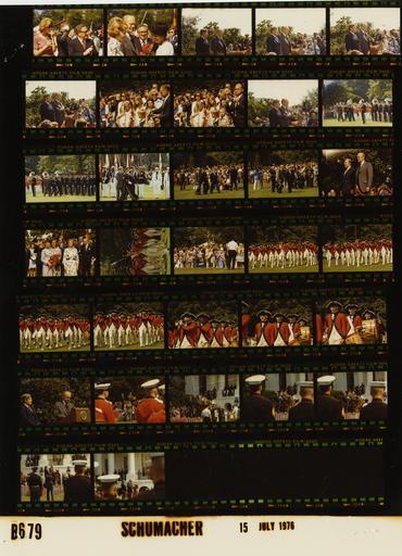 | Keywords: Ford B0679 NLGRF photo contact sheet (1976-07-15)(Gerald Ford Library).jpg White House Photographic Office WHPO is housed at the Gerald R Ford Presidential Library a branch of the National Archives and Records Administration NARA <br/><br/> This file is a 200 dpi photo contact sheet having images from roll of film B0679 of the August 9 1974 - January 20 1977 Gerald R Ford White House Photographic Office Series A0001-A9999 and B0001-B2886 photographs <br/><br/> The date on the photo contact sheet is the date the roll of film was processed not necessarily the date the photographs were taken See table below for additional details 1976-07-15 Gerald R Ford Presidential Library Image http //www fordlibrarymuseum gov/library/whphotos/B0679_NLGRF jpg B0679_NLGRF jpg from http //www fordlibrarymuseum gov/library/whphotos/19760715whpo pdf White House Photographs July 15 1976 of the http //www fordlibrarymuseum gov/Library/whphotos/whpo asp White House Photographic Collection page White House Photographic Office WHPO - Schumacher PD-USGov Institution Institution Gerald R Ford Presidential Library Table wikitable sortable + Photo contact sheet B0679 U S President Ford Administration Gerald R Ford Library Frame s Tone Subject proper Subject generic Names Geographic Location Photographer Date - 1A Color State Arrival Ceremony for the Chancellor of the Federal Republic of Germany FRG Mrs Schmidt standing awaiting arrival of Chancellor and Mrs Schmidt Henry Nancy Kissinger South Driveway Schumacher 1976-07-15 - 2A Color State Arrival Ceremony for the Chancellor of the Federal Republic of Germany FRG Mrs Schmidt BF and GRF talking to woman; HAK in background GRF Betty Ford Kissinger Unidentified Woman South Driveway Schumacher 1976-07-15 - 3A-6A Color State Arrival Ceremony for the Chancellor of the Federal Republic of Germany FRG Mrs Schmidt standing on lectern for anthems; GRF's hand over heart in last frame; medium range GRF Helmut Schmidt South Lawn Schumacher 1976-07-15 - 7A-8A Color State Arrival Ceremony for the Chancellor of the Federal Republic of Germany FRG Mrs Schmidt standing behind rope; many children; all not in frames Crowd South Lawn Schumacher 1976-07-15 - 9A Color State Arrival Ceremony for the Chancellor of the Federal Republic of Germany FRG Mrs Schmidt standing on lectern; GRF's hand over heart; medium range GRF Helmut Schmidt South Lawn Schumacher 1976-07-15 - 10A-14A Color State Arrival Ceremony for the Chancellor of the Federal Republic of Germany FRG Mrs Schmidt GRF and Schmidt walking past Guard; various angles and distances; all not in frames GRF Helmut Schmidt; Captain of the Guard Honor Guard South Lawn Schumacher 1976-07-15 - 15A Color State Arrival Ceremony for the Chancellor of the Federal Republic of Germany FRG Mrs Schmidt standing on lectern; medium range GRF Helmut Schmidt South Lawn Schumacher 1976-07-15 - 16A Color State Arrival Ceremony for the Chancellor of the Federal Republic of Germany FRG Mrs Schmidt standing; Mrs Schmidt holding bouquet of flowers Betty Ford Loki Schmidt; Others South Lawn Schumacher 1976-07-15 - 17A Color State Arrival Ceremony for the Chancellor of the Federal Republic of Germany FRG Mrs Schmidt marching performing; medium range Old Guard Fife Drum Corps South Lawn Schumacher 1976-07-15 - 18A Color State Arrival Ceremony for the Chancellor of the Federal Republic of Germany FRG Mrs Schmidt standing behind rope; all not in frame Crowd South Lawn Schumacher 1976-07-15 - 19A-25A Color State Arrival Ceremony for the Chancellor of the Federal Republic of Germany FRG Mrs Schmidt marching performing; moving toward camera Old Guard Fife Drum Corps South Lawn Schumacher 1976-07-15 - 26A Color State Arrival Ceremony for the Chancellor of the Federal Republic of Germany FRG Mrs Schmidt standing on lectern; GRF speaking; medium range GRF Helmut Schmidt South Lawn Schumacher 1976-07-15 - 27A-32A Color State Arrival Ceremony for the Chancellor of the Federal Republic of Germany FRG Mrs Schmidt GRF and Helmut Schmidt standing on lectern; partially obscured by military in foreground in most frames; White House in background GRF Helmut Schmidt; Military Others South Lawn Schumacher 1976-07-15 Gerald R Ford Presidential Library and Museum-cooperation PD-USGov Contact sheets by the Ford White House July 1976 Old Guard Fife and Drum Corps |