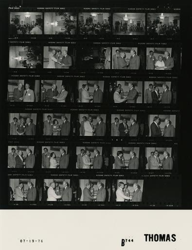 | Keywords: Ford B0744 NLGRF photo contact sheet (1976-07-19)(Gerald Ford Library).jpg White House Photographic Office WHPO is housed at the Gerald R Ford Presidential Library a branch of the National Archives and Records Administration NARA <br/><br/> This file is a 200 dpi photo contact sheet having images from roll of film B0744 of the August 9 1974 - January 20 1977 Gerald R Ford White House Photographic Office Series A0001-A9999 and B0001-B2886 photographs <br/><br/> The date on the photo contact sheet is the date the roll of film was processed not necessarily the date the photographs were taken See table below for additional details 1976-07-19 Gerald R Ford Presidential Library Image http //www fordlibrarymuseum gov/library/whphotos/B0744_NLGRF jpg B0744_NLGRF jpg from http //www fordlibrarymuseum gov/library/whphotos/19760719whpo pdf White House Photographs July 19 1976 of the http //www fordlibrarymuseum gov/Library/whphotos/whpo asp White House Photographic Collection page White House Photographic Office WHPO - Thomas PD-USGov Institution Institution Gerald R Ford Presidential Library Table wikitable sortable + Photo contact sheet B0744 U S President Ford Administration Gerald R Ford Library Frame s Tone Subject proper Subject generic Names Geographic Location Photographer Date - 3-8 BW Reception for Delegates and Alternates from New Jersey to the Republican National Convention GRF at lectern speaking; others seated in foreground; long shots from back of room; various angles; all not in frames GRF Delegates Alternates from New Jersey to the Republican National Convention State Dining Room Thomas 1976-07-19 - 9 BW Reception for Delegates and Alternates from New Jersey to the Republican National Convention greeting handshaking GRF holding book GRF Unidentified Man B Danskin H Kean M Rinaldo C Sandman W Todd K McDonald R Ergood R Boakes J White F Coldren P Matalucci H Brown H Haneman R Stanley R Stout J Rafferty C Roll F Kneisler P Freylinghausen L Gray A Merck R Sellars State Dining Room Thomas 1976-07-19 - 10 BW Reception for Delegates and Alternates from New Jersey to the Republican National Convention hand showing V for Victory State Dining Room Thomas 1976-07-19 - 11 BW Reception for Delegates and Alternates from New Jersey to the Republican National Convention standing talking posing; all not in frames GRF Unidentified Man B Danskin H Kean M Rinaldo C Sandman W Todd K McDonald R Ergood R Boakes J White F Coldren P Matalucci H Brown H Haneman R Stanley R Stout J Rafferty C Roll F Kneisler P Freylinghausen L Gray A Merck R Sellars State Dining Room Thomas 1976-07-19 - 12 BW Reception for Delegates and Alternates from New Jersey to the Republican National Convention greeting handshaking standing posing GRF Unidentified Woman M Scalia D Shepard N Schluter Mrs J Canter J Scancarella Mrs W Todd Mrs W Lalmero Mrs J Raffery F Henderson Others State Dining Room Thomas 1976-07-19 - 13-17 BW Reception for Delegates and Alternates from New Jersey to the Republican National Convention greeting handshaking standing posing GRF Unidentified Man J DeMarco E Forsythe W Dickey A D'Elia R Vander Plaat G Hagedorn T Bruinooge W Dewey E Englehardt SM LaCorte J Scancarella P Gervato J Russo Binder Wanner Couzzi Stubbs Others State Dining Room Thomas 1976-07-19 - 18-19 BW Reception for Delegates and Alternates from New Jersey to the Republican National Convention greeting handshaking standing posing GRF Unidentified Woman M Scalia D Shepard N Schluter Mrs J Canter J Scancarella Mrs W Todd Mrs W Lalmero Mrs J Raffery F Henderson Others State Dining Room Thomas 1976-07-19 - 20-23 BW Reception for Delegates and Alternates from New Jersey to the Republican National Convention standing talking posing; all not in frames GRF Unidentified Man B Danskin H Kean M Rinaldo C Sandman W Todd K McDonald R Ergood R Boakes J White F Coldren P Matalucci H Brown H Haneman R Stanley R Stout J Rafferty C Roll F Kneisler P Freylinghausen L Gray A Merck R Sellars State Dining Room Thomas 1976-07-19 - 24 BW Reception for Delegates and Alternates from New Jersey to the Republican National Convention standing talking posing; all not in frames GRF Unidentified Woman M Scalia D Shepard N Schluter Mrs J Canter J Scancarella Mrs W Todd Mrs W Lalmero Mrs J Raffery F Henderson Others State Dining Room Thomas 1976-07-19 - 25-31 BW Reception for Delegates and Alternates from New Jersey to the Republican National Convention standing talking posing; all not in frames GRF Unidentified Man B Danskin H Kean M Rinaldo C Sandman W Todd K McDonald R Ergood R Boakes J White F Coldren P Matalucci H Brown H Haneman R Stanley R Stout J Rafferty C Roll F Kneisler P Freylinghausen L Gray A Merck R Sellars State Dining Room Thomas 1976-07-19 Gerald R Ford Presidential Library and Museum-cooperation PD-USGov Contact sheets by the Ford White House July 1976 |