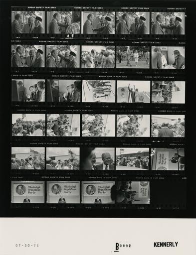 Keywords: Ford B0892 NLGRF photo contact sheet (1976-07-30)(Gerald Ford Library).jpg White House Photographic Office WHPO is housed at the Gerald R Ford Presidential Library a branch of the National Archives and Records Administration NARA <br/><br/> This file is a 200 dpi photo contact sheet having images from roll of film B0892 of the August 9 1974 - January 20 1977 Gerald R Ford White House Photographic Office Series A0001-A9999 and B0001-B2886 photographs <br/><br/> The date on the photo contact sheet is the date the roll of film was processed not necessarily the date the photographs were taken See table below for additional details 1976-07-30 Gerald R Ford Presidential Library Image http //www fordlibrarymuseum gov/library/whphotos/B0892_NLGRF jpg B0892_NLGRF jpg from http //www fordlibrarymuseum gov/library/whphotos/19760730whpo pdf White House Photographs July 30 1976 of the http //www fordlibrarymuseum gov/Library/whphotos/whpo asp White House Photographic Collection page White House Photographic Office WHPO <br/> Creator David Hume Kennerly PD-USGov Institution Institution Gerald R Ford Presidential Library Table wikitable sortable + Photo contact sheet B0892 U S President Ford Administration Gerald R Ford Library Frame s Tone Subject proper Subject generic Names Geographic Location Photographer Date - 2-8 BW Informal Meeting with Washington Post Photographer and Father greeting handshaking standing talking laughing; Neshan wearing wool hat GRF Harry Naltchayan Neshan Naltchayan Patio near Oval Office Kennerly 1976-07-30 - 9 BW Meeting with Christian Youth Fellowship Bicyclists Who Bicycled from Grand Rapids Michigan to Washington DC standing talking; South Portico in background; all not in frame GRF Betty Ford Christian Youth Fellowship Bicyclists; Others South Driveway Kennerly 1976-07-30 - 10 BW Meeting with Christian Youth Fellowship Bicyclists Who Bicycled from Grand Rapids Michigan to Washington DC GRF and BF walking toward camera and Marine One copter not seen ; others and South Portico in background; all not in frame GRF Betty Ford Christian Youth Fellowship Bicyclists; Others South Lawn Kennerly 1976-07-30 - 11-13 BW Flight to Andrews Air Force Base Prior to Campaign Trip to Mississippi to Meet Mississippi Delegates and Alternates to the Republican National Convention seated talking; GRF's back to camera GRF Cheney Nessen Dent Marine One Kennerly 1976-07-30 - 14 BW Arrival at Andrews Air Force Base Prior to Campaign Trip to Mississippi to Meet Mississippi Delegates and Alternates to the Republican National Convention talking walking away from Marine One; copter in background GRF Betty Ford Air Force Personnel Andrews Air Force Base MD Andrews Air Force Base Kennerly 1976-07-30 - 15 BW Prior to Campaign Trip to Mississippi to Meet Mississippi Delegates and Alternates to the Republican National Convention standing in doorway of Air Force One waving may also be arrival at Allen C Thompson Field Jackson MS GRF Betty Ford Andrews Air Force Base MD Andrews Air Force Base Kennerly 1976-07-30 - 16-23 BW Arrival for Campaign Trip to Mississippi to Meet Mississippi Delegates and Alternates to the Republican National Convention greeting handshaking; some people holding waving flags; various angles and distances; all not in every frame Betty Ford Crowd; Secret Service Jackson MS Allen C Thompson Field Kennerly 1976-07-30 - 24 BW Arrival for Campaign Trip to Mississippi to Meet Mississippi Delegates and Alternates to the Republican National Convention standing smiling; close up; partially obscured by head in foreground GRF Unidentied Man Jackson MS Allen C Thompson Field Kennerly 1976-07-30 - 25 BW Arrival for Campaign Trip to Mississippi to Meet Mississippi Delegates and Alternates to the Republican National Convention greeting handshaking; Kaiser to right of frame; limousine roof in foreground GRF Crowd; Keiser Jackson MS Allen C Thompson Field Kennerly 1976-07-30 - 26-30 BW Campaign Trip to Mississippi to Meet Mississippi Delegates and Alternates to the Republican National Convention speaking at lectern; close ups; Mississippi Republican Party Banner in background GRF Jackson MS Coliseum Ramada Inn -Room 1 Kennerly 1976-07-30 Gerald R Ford Presidential Library and Museum-cooperation PD-USGov Contact sheets by the Ford White House July 1976 Photographs by David Hume Kennerly from 1976 |