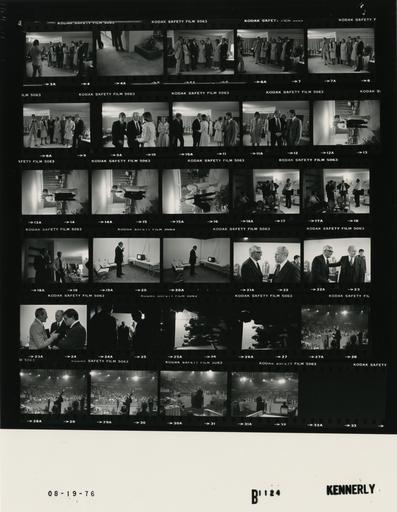 | Keywords: Ford B1124 NLGRF photo contact sheet (1976-08-19)(Gerald Ford Library).jpg White House Photographic Office WHPO is housed at the Gerald R Ford Presidential Library a branch of the National Archives and Records Administration NARA <br/><br/> This file is a 200 dpi photo contact sheet having images from roll of film B1124 of the August 9 1974 - January 20 1977 Gerald R Ford White House Photographic Office Series A0001-A9999 and B0001-B2886 photographs <br/><br/> The date on the photo contact sheet is the date the roll of film was processed not necessarily the date the photographs were taken See table below for additional details 1976-08-19 Gerald R Ford Presidential Library Image http //www fordlibrarymuseum gov/library/whphotos/B1124_NLGRF jpg B1124_NLGRF jpg from http //www fordlibrarymuseum gov/library/whphotos/19760819whpo pdf White House Photographs August 19 1976 of the http //www fordlibrarymuseum gov/Library/whphotos/whpo asp White House Photographic Collection page White House Photographic Office WHPO <br/> Creator David Hume Kennerly PD-USGov Institution Institution Gerald R Ford Presidential Library Table wikitable sortable + Photo contact sheet B1124 U S President Ford Administration Gerald R Ford Library Frame s Tone Subject proper Subject generic Names Geographic Location Photographer Date - 3A-8A BW Trip to Kansas City Missouri - Convention - Prior to Departure for Kemper Arena standing talking in row in 1st frame; posing in last 4 frames; 2nd frame blank GRF Betty Ford Jack Steve Susan Ford; Mike Gayle Ford Kansas City MO Crown Center Hotel - President's Suite Kennerly 1976-08-19 - 9A-11A BW Trip to Kansas City Missouri - Convention - Prior to Departure for Kemper Arena standing talking embracing handshaking; all not in every frame GRF Betty Ford Jack Steve Susan Ford; Mike Gayle Ford Kansas City MO Crown Center Hotel - President's Suite Kennerly 1976-08-19 - 12A-15A BW Trip to Kansas City Missouri - Convention - Prior to Departure for Kemper Arena embracing smiling; GRF holding suitcoat GRF Betty Ford Kansas City MO Crown Center Hotel - President's Suite Kennerly 1976-08-19 - 16A-18A BW Trip to Kansas City Missouri - Convention - Prior to Departure for Kemper Arena standing talking; Cheney on telephone; GRF coatless; O'Donnell seated in shadows in 1st frame GRF Cheney Marsh Kansas City MO Crown Center Hotel - President's Suite - Office Kennerly 1976-08-19 - 19A-20A BW Trip to Kansas City Missouri - Convention - Prior to Acceptance Speech at the Republican National Convention standing watching small television GRF Kansas City MO Kemper Arena - Holding Room Kennerly 1976-08-19 - 21A-22A BW Trip to Kansas City Missouri - Convention - Prior to Acceptance Speech at the Republican National Convention - Actor standing talking GRF Cary Grant Kansas City MO Kemper Arena - Holding Room Kennerly 1976-08-19 - 23A BW Trip to Kansas City Missouri - Convention - Receiving Final Instructions Prior to Acceptance Speech at the Republican National Convention standing talking GRF O'Donnell Unidentified Kansas City MO Kemper Arena - Holding Room Kennerly 1976-08-19 - 24A-26A BW Trip to Kansas City Missouri - Convention - Prior to Acceptance Speech at the Republican National Convention walking toward arena; not seen GRF Betty Ford Others Kansas City MO Corridor -Kemper Arena Kennerly 1976-08-19 - 27A-29A BW Trip to Kansas City Missouri - Convention - Acceptance Speech at the Republican National Convention GRF and BF at lectern waving; turning; taken from behind platform GRF Betty Ford; Crowd Kansas City MO Kemper Arena Kennerly 1976-08-19 - 30A-31A BW Trip to Kansas City Missouri - Convention - Acceptance Speech at the Republican National Convention GRF at lectern speaking back to camera; BF seated to left; crowd in background; taken from behind GRF GRF Betty Ford; Crowd Kansas City MO Kemper Arena Kennerly 1976-08-19 Gerald R Ford Presidential Library and Museum-cooperation PD-USGov Contact sheets by the Ford White House August 1976 Photographs by David Hume Kennerly from 1976 |