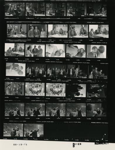 | Keywords: Ford B1125 NLGRF photo contact sheet (1976-08-19)(Gerald Ford Library).jpg White House Photographic Office WHPO is housed at the Gerald R Ford Presidential Library a branch of the National Archives and Records Administration NARA <br/><br/> This file is a 200 dpi photo contact sheet having images from roll of film B1125 of the August 9 1974 - January 20 1977 Gerald R Ford White House Photographic Office Series A0001-A9999 and B0001-B2886 photographs <br/><br/> The date on the photo contact sheet is the date the roll of film was processed not necessarily the date the photographs were taken See table below for additional details 1976-08-19 Gerald R Ford Presidential Library Image http //www fordlibrarymuseum gov/library/whphotos/B1125_NLGRF jpg B1125_NLGRF jpg from http //www fordlibrarymuseum gov/library/whphotos/19760819whpo pdf White House Photographs August 19 1976 of the http //www fordlibrarymuseum gov/Library/whphotos/whpo asp White House Photographic Collection page White House Photographic Office WHPO <br/> Creator David Hume Kennerly PD-USGov Institution Institution Gerald R Ford Presidential Library Table wikitable sortable + Photo contact sheet B1125 U S President Ford Administration Gerald R Ford Library Frame s Tone Subject proper Subject generic Names Geographic Location Photographer Date - 2-5 BW Trip to Kansas City Missouri - Convention seated at desk; close ups; GRF smoking pipe in 1st frame; NAR's back to camera GRF Rockefeller Kansas City MO Crown Center Hotel - President's Suite - Office Kennerly 1976-08-19 - 6 BW Trip to Kansas City Missouri - Convention GRF seated at desk sternfaced; Cheney leaning on desk; close up GRF Cheney Kansas City MO Crown Center Hotel - President's Suite - Office Kennerly 1976-08-19 - 7 BW Trip to Kansas City Missouri - Convention seated at desk; close up; NAR's back to camera GRF Rockefeller Kansas City MO Crown Center Hotel - President's Suite - Office Kennerly 1976-08-19 - 8 BW Trip to Kansas City Missouri - Convention - Prior to Announcement of Dole as Vice Presidential Candidate standing talking GRF Dole Elizabeth Dole Kansas City MO Crown Center Hotel - President's Suite - Office Kennerly 1976-08-19 - 9-10 BW Trip to Kansas City Missouri - Convention - Prior to Announcement of Dole as Vice Presidential Candidate seated at desk; close ups; laughing in 2nd frame GRF Dole Kansas City MO Crown Center Hotel - President's Suite - Office Kennerly 1976-08-19 - 11-12 BW Trip to Kansas City Missouri - Convention - Prior to Announcement of Dole as Vice Presidential Candidate seated at desk; close ups GRF Dole Rockefeller Kansas City MO Crown Center Hotel - President's Suite - Office Kennerly 1976-08-19 - 13 BW Trip to Kansas City Missouri - Convention - Prior to Announcement of Dole as Vice Presidential Candidate greeting handshaking GRF Dole Unidentified Woman Laxalt Sen Laxalt Kansas City MO Crown Center Hotel - President's Suite Kennerly 1976-08-19 - 14-17 BW Trip to Kansas City Missouri - Convention - Prior to Announcement of Dole as Vice Presidential Candidate embracing in 1st frame BF's back to camera; BF whispering in NAR's ear in last 2 frames; close ups Betty Ford Rockefeller Kansas City MO Crown Center Hotel - President's Suite Kennerly 1976-08-19 - 18-19 BW Trip to Kansas City Missouri - Convention - Announcement of Dole as Vice Presidential Candidate GRF at lectern; others standing behind; taken from back of room GRF Betty Ford Dole Elizabeth Dole Sens Laxalt Griffin Kansas City MO Crown Center Hotel - Century Room Kennerly 1976-08-19 - 20 BW Trip to Kansas City Missouri - Convention - Announcement of Dole as Vice Presidential Candidate Griffin and Laxalt at lectern; others standing behind; taken from back of room GRF Betty Ford Dole Elizabeth Dole Sens Laxalt Griffin Kansas City MO Crown Center Hotel - Century Room Kennerly 1976-08-19 - 21 BW Trip to Kansas City Missouri - Convention - Announcement of Dole as Vice Presidential Candidate standing near lectern; BF partially obscured GRF Betty Ford Dole Kansas City MO Crown Center Hotel - Century Room Kennerly 1976-08-19 - 22 BW Trip to Kansas City Missouri - Convention - Following Announcement of Dole as Vice Presidential Candidate standing Dole on telephone; close up GRF Dole Kansas City MO Crown Center Hotel - President's Suite - Office Kennerly 1976-08-19 - 23-24 BW Trip to Kansas City Missouri - Convention seated in chairs talking; Marsh not facing camera GRF Connally Marsh Kansas City MO Crown Center Hotel - President's Suite - Office Kennerly 1976-08-19 - 25 BW Trip to Kansas City Missouri - Convention - Prior to Acceptance Speech at the Republican National Convention walking toward arena; not seen GRF Betty Ford Others Kansas City MO Corridor -Kemper Arena Kennerly 1976-08-19 - 26-33 BW Trip to Kansas City Missouri - Convention - Acceptance Speech at the Republican National Convention GRF and BF at lectern waving; turning; taken from various angles and distances GRF Betty Ford; Crowd Kansas City MO Kemper Arena Kennerly 1976-08-19 Gerald R Ford Presidential Library and Museum-cooperation PD-USGov Contact sheets by the Ford White House August 1976 Photographs by David Hume Kennerly from 1976 |