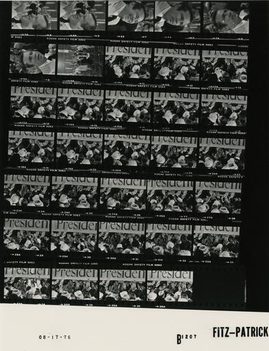 | Keywords: Ford B1207 NLGRF photo contact sheet (1976-08-16)(Gerald Ford Library).jpg White House Photographic Office WHPO is housed at the Gerald R Ford Presidential Library a branch of the National Archives and Records Administration NARA <br/><br/> This file is a 200 dpi photo contact sheet having images from roll of film B1207 of the August 9 1974 - January 20 1977 Gerald R Ford White House Photographic Office Series A0001-A9999 and B0001-B2886 photographs <br/><br/> The date on the photo contact sheet is the date the roll of film was processed not necessarily the date the photographs were taken See table below for additional details 1976-08-16 Gerald R Ford Presidential Library Image http //www fordlibrarymuseum gov/library/whphotos/B1207_NLGRF jpg B1207_NLGRF jpg from http //www fordlibrarymuseum gov/library/whphotos/19760816whpo pdf White House Photographs August 16 1976 of the http //www fordlibrarymuseum gov/Library/whphotos/whpo asp White House Photographic Collection page White House Photographic Office WHPO - Fitz-Patrick PD-USGov Institution Institution Gerald R Ford Presidential Library Table wikitable sortable + Photo contact sheet B1207 U S President Ford Administration Gerald R Ford Library Frame s Tone Subject proper Subject generic Names Geographic Location Photographer Date - 3A-8A BW Trip to Kansas City Missouri - Convention - First Session of the Republican National Convention head and shoulder portraits; close ups; holding camera to eye in 1st two frames Sen Baker Kansas City MO Kemper Arena - Floor Fitz-Patrick 1976-08-16 - 9A BW Trip to Kansas City Missouri - Convention - First Session of the Republican National Convention standing on floor making gesture odd facial expression Sen Scranton Kansas City MO Kemper Arena - Floor Fitz-Patrick 1976-08-16 - 10A-36A BW Trip to Kansas City Missouri - Convention - Ford Rally at the Youth Hold Center Susan and Steve at mike under large President Ford banner; each speaking separately then together; Orlando at microphone; Jack Ford at mike; crowd pushing forward in foreground Susan Ford Steve Ford; Tony Orlando; Jack Ford; Presidentials Kansas City MO K C Trade Mart - Youth Hold Center Fitz-Patrick 1976-08-16 Gerald R Ford Presidential Library and Museum-cooperation PD-USGov Contact sheets by the Ford White House August 1976 |
