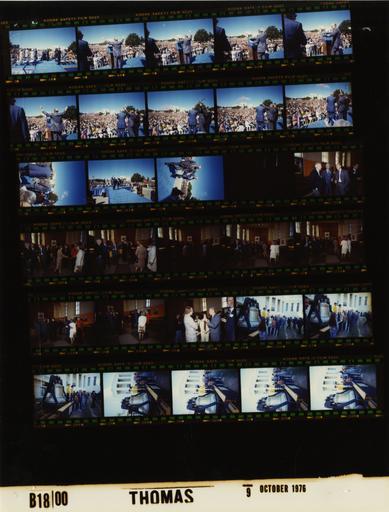 | Keywords: Ford B1800 NLGRF photo contact sheet (1976-10-09)(Gerald Ford Library).jpg White House Photographic Office WHPO is housed at the Gerald R Ford Presidential Library a branch of the National Archives and Records Administration NARA <br/><br/> This file is a 200 dpi photo contact sheet having images from roll of film B1800 of the August 9 1974 - January 20 1977 Gerald R Ford White House Photographic Office Series A0001-A9999 and B0001-B2886 photographs <br/><br/> The date on the photo contact sheet is the date the roll of film was processed not necessarily the date the photographs were taken See table below for additional details 1976-10-09 Gerald R Ford Presidential Library Image http //www fordlibrarymuseum gov/library/whphotos/B1800_NLGRF jpg B1800_NLGRF jpg from http //www fordlibrarymuseum gov/library/whphotos/19761009whpo pdf White House Photographs October 9 1976 of the http //www fordlibrarymuseum gov/Library/whphotos/whpo asp White House Photographic Collection page White House Photographic Office WHPO - Thomas PD-USGov Institution Institution Gerald R Ford Presidential Library Table wikitable sortable + Photo contact sheet B1800 U S President Ford Administration Gerald R Ford Library Frame s Tone Subject proper Subject generic Names Geographic Location Photographer Date - 3A-12A Color Campaign Trip to Texas - Opening of the Texas State Fair GRF at lectern speaking waving back to camera; crowd in background; cloud of helium balloons rising in last 4 frames; long shots; all not in every frame GRF Gov Briscoe Platform Guests; Crowd Dallas TX Texas State Fair - Platform Thomas 1976-10-09 - 13A-15A Color Campaign Trip to Texas - Opening of the Texas State Fair GRF and Connally walking toward camera; others in background; all not in every frame GRF Connally Platform Guests; Crowd Dallas TX Texas State Fair - Platform Thomas 1976-10-09 - 16A Color Campaign Trip to Texas - Opening of the Texas State Fair Thomas 1976-10-09 - 17A-25A Color Campaign Trip to Texas - Reception Sponsored by the Texas State Fair Board greeting handshaking standing talking; various angles and distances; all not in every frame GRF Connally Texas State Fair Board Members; Others Dallas TX North Texas Room - Texas State Fair Thomas 1976-10-09 - 26A-32A Color Campaign Trip to Texas - Opening of the Texas State Fair GRF posing waving talking to boys and girls near large bell mounted on Thanksgiving Square Platform GRF Two Boys Two Girls Others Dallas TX Thanksgiving Square - Texas State Fair Thomas 1976-10-09 Gerald R Ford Presidential Library and Museum-cooperation PD-USGov Contact sheets by the Ford White House October 1976 |