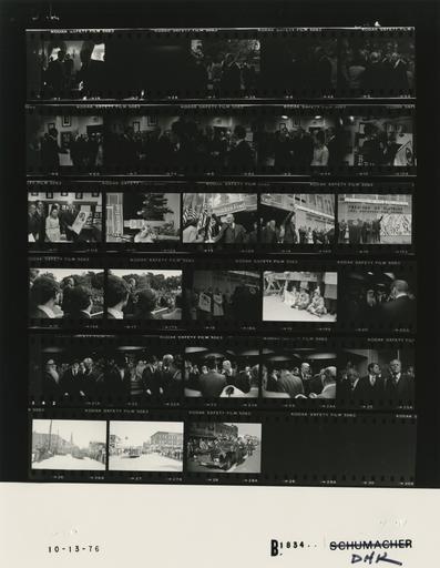 | Keywords: Ford B1834 NLGRF photo contact sheet (1976-10-12)(Gerald Ford Library).jpg White House Photographic Office WHPO is housed at the Gerald R Ford Presidential Library a branch of the National Archives and Records Administration NARA <br/><br/> This file is a 200 dpi photo contact sheet having images from roll of film B1834 of the August 9 1974 - January 20 1977 Gerald R Ford White House Photographic Office Series A0001-A9999 and B0001-B2886 photographs <br/><br/> The date on the photo contact sheet is the date the roll of film was processed not necessarily the date the photographs were taken See table below for additional details 1976-10-12 Gerald R Ford Presidential Library Image http //www fordlibrarymuseum gov/library/whphotos/B1834_NLGRF jpg B1834_NLGRF jpg from http //www fordlibrarymuseum gov/library/whphotos/19761012whpo pdf White House Photographs October 12 1976 of the http //www fordlibrarymuseum gov/Library/whphotos/whpo asp White House Photographic Collection page White House Photographic Office WHPO <br/> Creator David Hume Kennerly PD-USGov Institution Institution Gerald R Ford Presidential Library Table wikitable sortable + Photo contact sheet B1834 U S President Ford Administration Gerald R Ford Library Frame s Tone Subject proper Subject generic Names Geographic Location Photographer Date - 1 BW Possibly Meeting with American Leaders of East European Ancestry handshaking GRF Others Cabinet Room Kennerly 1976-10-12 - 2 BW Kennerly 1976-10-12 - 3-5 BW Campaign Trip to New York - Arrival for Tour of the Center for Holocaust Studies greeting handshaking; all not in every frame GRF G Klein Y Eliach F Goldschmidt Others Brooklyn NY Yeshiva of Flatbush High School - Outside Kennerly 1976-10-12 - 6-11 BW Campaign Trip to New York - Tour of the Center for Holocaust Studies walking talking looking at exhibits; various angles; all not in every frame GRF Y Eliach Others Brooklyn NY Yeshiva of Flatbush High School - Center for Holocaust Studies Kennerly 1976-10-12 - 12-15 BW Campaign Trip to New York - Following Tour of the Center for Holocaust Studies GRF walking out door waving to crowd not seen GRF Others Brooklyn NY Yeshiva of Flatbush High School - Outside Kennerly 1976-10-12 - 16-17 BW Campaign Trip to New York - Remarks Following Tour of the Center for Holocaust Studies GRF at lectern speaking; taken from right and behind GRF; students in foreground; others in background GRF Students Others Brooklyn NY Yeshiva of Flatbush High School - Outside Kennerly 1976-10-12 - 18 BW Campaign Trip to New York - Remarks Following Tour of the Center for Holocaust Studies GRF at lectern speaking close-ups; others and high school sign in background; all not in every frame GRF Sens Javits Buckley Richard Rosenbaum G Klein Y Eliach F Goldschmidt Others Brooklyn NY Yeshiva of Flatbush High School - Outside Kennerly 1976-10-12 - 19 BW Campaign Trip to New York - Remarks Following Tour of the Center for Holocaust Studies seated on curb under police barricade Three Children Brooklyn NY Yeshiva of Flatbush High School - Outside Kennerly 1976-10-12 - 20-25 BW Campaign Trip to New York - Meeting with New York Jewish Leaders greeting handshaking standing talking; various angles and distances; all not in every frame GRF New York Jewish Leaders Brooklyn NY Yeshiva of Flatbush High School - Meeting Room Kennerly 1976-10-12 - 26-28 BW Campaign Trip to New York - Motorcade through Brooklyn Borough Park Bay Ridge GRF and Buckley standing through roof of limousine waving; GRF using microphone; agents walking alongside; crowd in background; various angles and distances GRF Sen Buckley Secret Service Crowd Brooklyn NY Street Kennerly 1976-10-12 Gerald R Ford Presidential Library and Museum-cooperation PD-USGov Contact sheets by the Ford White House October 1976 Photographs by David Hume Kennerly from 1976 |