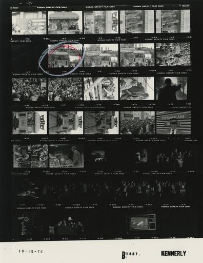 | Keywords: Ford B1887 NLGRF photo contact sheet (1976-10-16)(Gerald Ford Library).jpg White House Photographic Office WHPO is housed at the Gerald R Ford Presidential Library a branch of the National Archives and Records Administration NARA <br/><br/> This file is a 200 dpi photo contact sheet having images from roll of film B1887 of the August 9 1974 - January 20 1977 Gerald R Ford White House Photographic Office Series A0001-A9999 and B0001-B2886 photographs <br/><br/> The date on the photo contact sheet is the date the roll of film was processed not necessarily the date the photographs were taken See table below for additional details 1976-10-16 Gerald R Ford Presidential Library Image http //www fordlibrarymuseum gov/library/whphotos/B1887_NLGRF jpg B1887_NLGRF jpg from http //www fordlibrarymuseum gov/library/whphotos/19761016whpo pdf White House Photographs October 16 1976 of the http //www fordlibrarymuseum gov/Library/whphotos/whpo asp White House Photographic Collection page White House Photographic Office WHPO <br/> Creator David Hume Kennerly PD-USGov Institution Institution Gerald R Ford Presidential Library Table wikitable sortable + Photo contact sheet B1887 U S President Ford Administration Gerald R Ford Library Frame s Tone Subject proper Subject generic Names Geographic Location Photographer Date - 2 BW Whistlestop Campaign Trip through Illinois - Prior to Start of Train Trip standing in front of large American Flag opened across building Unidentified Woman Pontiac IL Pontiac Amtrak Train Station Kennerly 1976-10-16 - 3-6 BW Whistlestop Campaign Trip through Illinois - Prior to Start of Train Trip standing on rear platform of The Honest Abe Train Car; Madigan at microphone in 1st frame; GRF speaking in remainder; taken from track level; all not in every frame GRF Betty Ford Sen Percy Rep Madigan Others Pontiac IL Pontiac Amtrak Train Station Kennerly 1976-10-16 - 7 BW Kennerly 1976-10-16 - 8-10 BW Whistlestop Campaign Trip through Illinois - Train Trip standing on rear platform of The Honest Abe Train Car; crowd on tracks in foreground and on viaduct above train; sign reading McLean County Farmers for Ford GRF Betty Ford Sen Percy Gov Thompson; Crowd Bloomington McClean Cty IL Bloomington Amtrak Train Station Kennerly 1976-10-16 - 11-13 BW Whistlestop Campaign Trip through Illinois - Train Trip GRF walking on tracks; greeting handshaking mingling with crowd; various angles and distances; all not in every frame GRF Crowd Bloomington McClean Cty IL Bloomington Amtrak Train Station Kennerly 1976-10-16 - 14 BW Whistlestop Campaign Trip through Illinois - Train Trip man reaching back to hand GRF a cup of water GRF Unidentified Man Crowd Bloomington McClean Cty IL Bloomington Amtrak Train Station Kennerly 1976-10-16 - 15 BW Whistlestop Campaign Trip through Illinois - Train Trip woman seated in wheelchair GRF stepping away after handshake GRF Unidentified Woman Bloomington McClean Cty IL Bloomington Amtrak Train Station Kennerly 1976-10-16 - 16 BW Whistlestop Campaign Trip through Illinois - Train Trip standing waving on rear platform of The Honest Abe Train Car; in sillhouette GRF Bloomington McClean Cty IL Bloomington Amtrak Train Station Kennerly 1976-10-16 - 17-19 BW Whistlestop Campaign Trip through Illinois - Train Trip GRF and BF standing waving on rear platform of The Honest Abe Train Car; moving away from camera GRF Betty Ford Crowd Lincoln IL Lincoln Amtrak Train Station Kennerly 1976-10-16 - 20 BW Whistlestop Campaign Trip through Illinois; Train Trip - Springfield Illinois GRF mingling greeting handshaking; surrounded by crowd; long shot GRF Secret Service Crowd Springfield IL Springfield Amtrak Train Station Kennerly 1976-10-16 - 21 BW Whistlestop Campaign Trip through Illinois; Train Trip - Springfield Illinois standing in front of The Honest Abe wearing conductor's cap O'Donnell Springfield IL Springfield Amtrak Train Station Kennerly 1976-10-16 - 22 BW Whistlestop Campaign Trip through Illinois; Train Trip - Springfield Illinois standing behind rope; boy ducking holding ears in front of trombone Crowd Band Springfield IL Springfield Amtrak Train Station Kennerly 1976-10-16 - 23 BW Whistlestop Campaign Trip through Illinois; Train Trip - Springfield Illinois standing talking on rear platform of The Honest Abe Train Car GRF Unidentified Man Woman Springfield IL Springfield Amtrak Train Station Kennerly 1976-10-16 - 24-25 BW Whistlestop Campaign Trip through Illinois - Train Trip GRF and BF standing waving on rear platform of The Honest Abe Train Car; crowd in foreground; long shots; night shots GRF Betty Ford Sen Percy Crowd Alton IL Alton Amtrak Train Station Kennerly 1976-10-16 - 26-27 BW Whistlestop Campaign Trip through Illinois - Train Trip standing near lectern waving arms raised over heads in one frame; all not in frames; night shots GRF Betty Ford Gov Bond Gene McNary Others Crowd Alton IL Alton Amtrak Train Station Kennerly 1976-10-16 - 28-33 BW Whistlestop Campaign Trip through Illinois - Train Trip GRF at lectern speaking; others not in every frame; night shots GRF Betty Ford Gov Bond Gene McNary Others Crowd Alton IL Alton Amtrak Train Station Kennerly 1976-10-16 - 34 BW Kennerly 1976-10-16 - 35 BW Campaign Stop in Missouri - St Louis Missouri Detroit Lions - Washington Redskins football game on television St Louis MO Lambert Field - Rockwell International Services Building Kennerly 1976-10-16 Gerald R Ford Presidential Library and Museum-cooperation PD-USGov Contact sheets by the Ford White House October 1976 Photographs by David Hume Kennerly from 1976 |