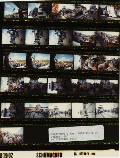 | Keywords: Ford B1902 NLGRF photo contact sheet (1976-10-16)(Gerald Ford Library).jpg White House Photographic Office WHPO is housed at the Gerald R Ford Presidential Library a branch of the National Archives and Records Administration NARA <br/><br/> This file is a 200 dpi photo contact sheet having images from roll of film B1902 of the August 9 1974 - January 20 1977 Gerald R Ford White House Photographic Office Series A0001-A9999 and B0001-B2886 photographs <br/><br/> The date on the photo contact sheet is the date the roll of film was processed not necessarily the date the photographs were taken See table below for additional details 1976-10-16 Gerald R Ford Presidential Library Image http //www fordlibrarymuseum gov/library/whphotos/B1902_NLGRF jpg B1902_NLGRF jpg from http //www fordlibrarymuseum gov/library/whphotos/19761016whpo pdf White House Photographs October 16 1976 of the http //www fordlibrarymuseum gov/Library/whphotos/whpo asp White House Photographic Collection page White House Photographic Office WHPO - Schumacher PD-USGov Institution Institution Gerald R Ford Presidential Library Table wikitable sortable + Photo contact sheet B1902 U S President Ford Administration Gerald R Ford Library Frame s Tone Subject proper Subject generic Names Geographic Location Photographer Date - 2A Color Whistlestop Campaign Trip through Illinois - Train Trip standing waving on rear platform of The Honest Abe Train Car Betty Ford Lincoln IL Lincoln Amtrak Train Station Schumacher 1976-10-16 - 3A-5A Color Whistlestop Campaign Trip through Illinois - Train Trip standing on rear platform of The Honest Abe Train Car; various distances; all not in evey frame GRF Betty Ford Sen Percy Gov Thompson; Crowd Lincoln IL Lincoln Amtrak Train Station Schumacher 1976-10-16 - 6A Color Whistlestop Campaign Trip through Illinois - Train Trip holding handmade poster signs Crowd Lincoln IL Lincoln Amtrak Train Station Schumacher 1976-10-16 - 7A-9A Color Whistlestop Campaign Trip through Illinois - Train Trip GRF attempting to split rail with large mallet; man resembles Abraham Lincoln; crowd in background GRF Unidentified Man Crowd Lincoln IL Lincoln Amtrak Train Station Schumacher 1976-10-16 - 10A-11A Color Whistlestop Campaign Trip through Illinois - Train Trip man showing GRF pumpkins and apples; GRF drinking cider in 2nd frame GRF Unidentified Man Lincoln IL Lincoln Amtrak Train Station Schumacher 1976-10-16 - 12A-14A Color Whistlestop Campaign Trip through Illinois - Train Trip GRFstanding talking into microphone on rear platform of The Honest Abe Train Car; taken from right of GRF crowd visible to left of GRF GRF Crowd Lincoln IL Lincoln Amtrak Train Station Schumacher 1976-10-16 - 15A-17A Color Whistlestop Campaign Trip through Illinois - Train Trip GRF looking at crafts on table; women wearing 19th century bonnets GRF Unidentified women Lincoln IL Lincoln Amtrak Train Station Schumacher 1976-10-16 - 18A-22A Color Whistlestop Campaign Trip through Illinois - Train Trip standing talking posing on tracks; The Honest Abe Train Car is directly behind GRF Unidentified women Lincoln IL Lincoln Amtrak Train Station Schumacher 1976-10-16 - 23A-26A Color Whistlestop Campaign Trip through Illinois; Train Trip; Governor and US Senator from Illinois IL -Springfield Illinois GRF talking standing on rear platform of The Honest Abe Train Car; crowd on wither side; long shots GRF Betty Ford Sen Percy Gov Thompson; Crowd Springfield IL Springfield Amtrak Train Station Schumacher 1976-10-16 - 27A Color Whistlestop Campaign Trip through Illinois; Train Trip - Springfield Illinois greeting handskaking mingling; train station in background GRF Secret Service Crowd Springfield IL Springfield Amtrak Train Station Schumacher 1976-10-16 Gerald R Ford Presidential Library and Museum-cooperation PD-USGov Contact sheets by the Ford White House October 1976 |
