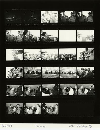 | Keywords: Ford B2089 NLGRF photo contact sheet (1976-10-24)(Gerald Ford Library).jpg White House Photographic Office WHPO is housed at the Gerald R Ford Presidential Library a branch of the National Archives and Records Administration NARA <br/><br/> This file is a 200 dpi photo contact sheet having images from roll of film B2089 of the August 9 1974 - January 20 1977 Gerald R Ford White House Photographic Office Series A0001-A9999 and B0001-B2886 photographs <br/><br/> The date on the photo contact sheet is the date the roll of film was processed not necessarily the date the photographs were taken See table below for additional details 1976-10-24 Gerald R Ford Presidential Library Image http //www fordlibrarymuseum gov/library/whphotos/B2089_NLGRF jpg B2089_NLGRF jpg from http //www fordlibrarymuseum gov/library/whphotos/19761024whpo pdf White House Photographs October 24 1976 of the http //www fordlibrarymuseum gov/Library/whphotos/whpo asp White House Photographic Collection page White House Photographic Office WHPO - Thomas PD-USGov Institution Institution Gerald R Ford Presidential Library Table wikitable sortable + Photo contact sheet B2089 U S President Ford Administration Gerald R Ford Library Frame s Tone Subject proper Subject generic Names Geographic Location Photographer Date - 2-3 Color Campaign Trip to California - Rally at Lindbergh Field dancing on stage; San Diego County Welcomes President Ford sign in background San Diego Chicken San Diego CA Lindbergh Field Thomas 1976-10-24 - 4 Color Campaign Trip to California - Prior to Departure for Seattle Washington greeting handshaking GRF Unidentified Man San Diego CA Lindbergh Field Thomas 1976-10-25 - 5-9 Color Campaign Trip to Washington; Hydrofoil Trip on Puget Sound; Governor of Washington WA - Seattle Washington seated talking; various angles and distances; all not in every frame GRF Gov Evans Others Seattle WA Hydrofoil - Puget Sound Thomas 1976-10-25 - 10 Color Campaign Trip to Washington; Hydrofoil Trip on Puget Sound -Seattle Washington downtown Seattle Seattle WA Puget Sound Thomas 1976-10-25 - 11-12 Color Campaign Trip to Washington; Campaign Rally at Pier 57 Park - Seattle Washington GRF on platform standing talking GRF Others Seattle WA Pier 57 Park Thomas 1976-10-25 - 13-15 Color Campaign Trip to Washington; Campaign Rally at Pier 57 Park - Seattle Washington GRF at lectern speaking; long shots from behind crowd GRF Others Crowd Seattle WA Pier 57 Park Thomas 1976-10-25 - 16-17 Color Campaign Trip to Washington; Campaign Rally at Pier 57 Park - Seattle Washington standing laughing on pier; water in right; people on left Kennerly Unidentified Woman Seattle WA Pier 57 Park Thomas 1976-10-25 - 18-20 Color Campaign Trip To Washington; Visit to Veterans Administration Hospital - Seattle Washington GRF standing talking at lectern; VA sign and others in background GRF Others Seattle WA Veterans Administration Hospital Thomas 1976-10-25 - 21 Color Campaign Trip To Washington; Following Visit to Veterans Administration Hospital - Seattle Washington greeting handshaking standing talking GRF Unidentified Family Seattle WA Veterans Administration Hospital Thomas 1976-10-25 - 22-24 Color Campaign Trip To Oregon; Prior to Departure for Pittsburgh Pennsylvania; New York Times Reporter - Portland Oregon greeting handshaking standing talking; night shots GRF San Diego Chicken James Naughton Portland OR Portland International Airport Thomas 1976-10-25 - 25-29 Color Campaign Trip To Oregon; Prior to Departure for Pittsburgh Pennsylvania - Portland Oregon greeting handshaking standing talking; all not in every frame; night shots GRF Others Portland OR Portland International Airport Thomas 1976-10-25 Gerald R Ford Presidential Library and Museum-cooperation PD-USGov Contact sheets by the Ford White House October 1976 |