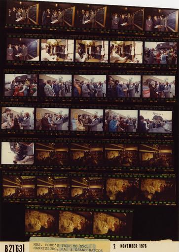 | Keywords: Ford B2163 NLGRF photo contact sheet (1976-11-02)(Gerald Ford Library).jpg White House Photographic Office WHPO is housed at the Gerald R Ford Presidential Library a branch of the National Archives and Records Administration NARA <br/><br/> This file is a 200 dpi photo contact sheet having images from roll of film B2163 of the August 9 1974 - January 20 1977 Gerald R Ford White House Photographic Office Series A0001-A9999 and B0001-B2886 photographs <br/><br/> The date on the photo contact sheet is the date the roll of film was processed not necessarily the date the photographs were taken See table below for additional details 1976-11-02 Gerald R Ford Presidential Library Image http //www fordlibrarymuseum gov/library/whphotos/B2163_NLGRF jpg B2163_NLGRF jpg from http //www fordlibrarymuseum gov/library/whphotos/19761102whpo pdf White House Photographs November 2 1976 of the http //www fordlibrarymuseum gov/Library/whphotos/whpo asp White House Photographic Collection page White House Photographic Office WHPO - Schumacher PD-USGov Institution Institution Gerald R Ford Presidential Library Table wikitable sortable + Photo contact sheet B2163 U S President Ford Administration Gerald R Ford Library Frame s Tone Subject proper Subject generic Names Geographic Location Photographer Date - 5-10 Color Campaign Trip to Michigan - Ford Family Post-Election Ritual Following Casting of Ballots GRF and BF signing guest book; specials menu on blackboard on right of photo; Media covering event GRF Betty Ford Media; Secret Service Grand Rapids MI Granny's Kitchen Restaurant Schumacher 1976-11-02 - 11-13 Color Campaign Trip to Michigan - Ford Family Post-Election Ritual Following Casting of Ballots GRF peering through bars talking to cashier GRF Cashier Grand Rapids MI Granny's Kitchen Restaurant Schumacher 1976-11-02 - 14-25 Color Campaign Trip to Michigan - Following Ford Family Post-Election Ritual Following Casting of Ballots greeting handshaking standing talking; various angles and distances; all not in every frame; Granny's sign in some frames; Curious World Pet Center in background in some frames Betty Ford Crowd Grand Rapids MI Granny's Kitchen Restaurant - Outside Schumacher 1976-11-02 - 26-32 Color Campaign Trip to Michigan - Gerald R Ford Mural Dedication Ceremony standing to left of Gerald R Ford Mural; long shots from left of mural GRF Betty Ford Paul Collins Others Children Grand Rapids MI Kent County Airport - Terminal Schumacher 1976-11-02 - 33-37 Color Campaign Trip to Michigan - Gerald R Ford Mural Dedication Ceremony standing posing in front of Gerald R Ford Mural; medium range shots from left of mural GRF Betty Ford Paul Collins Grand Rapids MI Kent County Airport - Terminal Schumacher 1976-11-02 Gerald R Ford Presidential Library and Museum-cooperation PD-USGov Contact sheets by the Ford White House November 1976 |