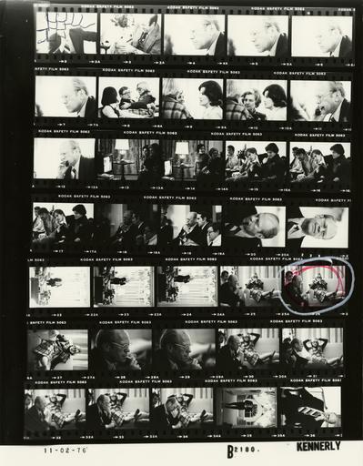 | Keywords: Ford B2180 NLGRF photo contact sheet (1976-11-02)(Gerald Ford Library).jpg White House Photographic Office WHPO is housed at the Gerald R Ford Presidential Library a branch of the National Archives and Records Administration NARA <br/><br/> This file is a 200 dpi photo contact sheet having images from roll of film B2180 of the August 9 1974 - January 20 1977 Gerald R Ford White House Photographic Office Series A0001-A9999 and B0001-B2886 photographs <br/><br/> The date on the photo contact sheet is the date the roll of film was processed not necessarily the date the photographs were taken See table below for additional details 1976-11-02 Gerald R Ford Presidential Library Image http //www fordlibrarymuseum gov/library/whphotos/B2180_NLGRF jpg B2180_NLGRF jpg from http //www fordlibrarymuseum gov/library/whphotos/19761102whpo pdf White House Photographs November 2 1976 of the http //www fordlibrarymuseum gov/Library/whphotos/whpo asp White House Photographic Collection page White House Photographic Office WHPO <br/> Creator David Hume Kennerly PD-USGov Institution Institution Gerald R Ford Presidential Library Table wikitable sortable + Photo contact sheet B2180 U S President Ford Administration Gerald R Ford Library Frame s Tone Subject proper Subject generic Names Geographic Location Photographer Date - 2 BW Election Night Activities seated hand on chin; close up GRF Second Floor - West Sitting Room Kennerly 1976-11-02 - 3 BW Election Night Activities - Pet Golden Retriever Garagiola petting dog's head smiling; close up Joe Garagiola Liberty Misty Second Floor - West Sitting Room Kennerly 1976-11-02 - 4-7 BW Election Night Activities left profile head and shoulder portraits GRF Second Floor - West Sitting Room Kennerly 1976-11-02 - 8 BW Election Night Activities Susan seated in Pete Secchia's lap; Joan in foreground back to camera Susan Ford Pete Joan Secchia Second Floor - West Sitting Room Kennerly 1976-11-02 - 9-10 BW Election Night Activities standing talking; head and shoulder close ups; SF's back to camera Betty Ford Susan Ford Elizabeth Dole Second Floor - West Sitting Room Kennerly 1976-11-02 - 11-12 BW Election Night Activities smoking pipe; left profile head and shoulder portraits GRF Second Floor - West Sitting Room Kennerly 1976-11-02 - 13-14 BW Election Night Activities seated looking at television; close ups Betty Ford Pullen Second Floor - President's Study Kennerly 1976-11-02 - 15-17 BW Election Night Activities seated Mike on telephone; somber looks on faces; close ups Mike Gayle Ford Second Floor - West Sitting Room Kennerly 1976-11-02 - 18-19 BW Election Night Activities seated watching television not seen ; GRF smoking pipe GRF Dole Parma Second Floor - West Sitting Room Kennerly 1976-11-02 - 20 BW Election Night Activities smoking pipe head down no glasses; close up GRF Second Floor - West Sitting Room Kennerly 1976-11-02 - 21 BW Election Night Activities anguished smile; close up GRF Second Floor - West Sitting Room Kennerly 1976-11-02 - 22-24 BW Election Night Activities standing; hand on chin head cast downward in last 2 frames; long shots GRF Second Floor - West Sitting Room Kennerly 1976-11-02 - 25-26 BW Election Night Activities GRF and man in foreground out of focus; SF seated in background feet on hassock hands to mouth GRF Unidentified Man Susan Ford Second Floor - West Sitting Room Kennerly 1976-11-02 - 27 BW Election Night Activities seated feet on hassock Susan Ford Second Floor - West Sitting Room Kennerly 1976-11-02 - 28-29 BW Election Night Activities smoking pipe right profile head and shoulder portraits GRF Second Floor - West Sitting Room Kennerly 1976-11-02 - 30-34 BW Election Night Activities GRF in foreground smoking pipe rubbing head and chin; SF seated in background feet on hassock hands clasped behind head GRF Susan Ford Second Floor - West Sitting Room Kennerly 1976-11-02 - 35 BW Election Night Activities walking toward camera head down holding piece of paper GRF Second Floor - Center Hall Kennerly 1976-11-02 - 36 BW Election Night Activities seated in chair left hand on chin; somber expression GRF Second Floor - President and Mrs Ford's Bedroom Kennerly 1976-11-02 Gerald R Ford Presidential Library and Museum-cooperation PD-USGov Contact sheets by the Ford White House November 1976 Photographs by David Hume Kennerly from 1976 |