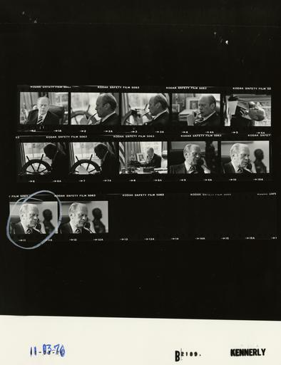 Keywords: Ford B2189 NLGRF photo contact sheet (1976-11-03)(Gerald Ford Library).jpg White House Photographic Office WHPO is housed at the Gerald R Ford Presidential Library a branch of the National Archives and Records Administration NARA <br/><br/> This file is a 200 dpi photo contact sheet having images from roll of film B2189 of the August 9 1974 - January 20 1977 Gerald R Ford White House Photographic Office Series A0001-A9999 and B0001-B2886 photographs <br/><br/> The date on the photo contact sheet is the date the roll of film was processed not necessarily the date the photographs were taken See table below for additional details 1976-11-03 Gerald R Ford Presidential Library Image http //www fordlibrarymuseum gov/library/whphotos/B2189_NLGRF jpg B2189_NLGRF jpg from http //www fordlibrarymuseum gov/library/whphotos/19761103whpo pdf White House Photographs November 3 1976 of the http //www fordlibrarymuseum gov/Library/whphotos/whpo asp White House Photographic Collection page White House Photographic Office WHPO <br/> Creator David Hume Kennerly PD-USGov Institution Institution Gerald R Ford Presidential Library Table wikitable sortable + Photo contact sheet B2189 U S President Ford Administration Gerald R Ford Library Frame s Tone Subject proper Subject generic Names Geographic Location Photographer Date - 1 BW Prior to Making Congratulatory Telephone Call to Jimmy Carter seated at desk looking downward; close up GRF Oval Office Kennerly 1976-11-03 - 2-4 BW Prior to Making Congratulatory Telephone Call to Jimmy Carter seated at desk smoking pipe; left side profile; Mayaguez wheel in background; close up GRF Oval Office Kennerly 1976-11-03 - 5 BW Prior to Making Congratulatory Telephone Call to Jimmy Carter seated at desk looking to side; pensive expression; close up GRF Oval Office Kennerly 1976-11-03 - 6-7 BW Prior to Making Congratulatory Telephone Call to Jimmy Carter seated at desk reading phone call document Mayaguez wheel in background; left side profile; close up GRF Oval Office Kennerly 1976-11-03 - 8 BW Prior to Making Congratulatory Telephone Call to Jimmy Carter seated at desk reading phone call document hand on chin; photo of Betty in white satin Chinese dress from Treaty Room photo in rear; ong shot GRF Oval Office Kennerly 1976-11-03 - 9-12 BW Making Congratulatory Telephone Call to Jimmy Carter seated at desk talking on telephone; close ups; Truman bust in background GRF Oval Office Kennerly 1976-11-03 - 17-18 Color Meeting in Oval Office standing posing; GRF in middle GRF Edith Green Richard Green Oval Office Schumacher 1976-11-03 Gerald R Ford Presidential Library and Museum-cooperation PD-USGov Contact sheets by the Ford White House November 1976 Photographs by David Hume Kennerly from 1976 |